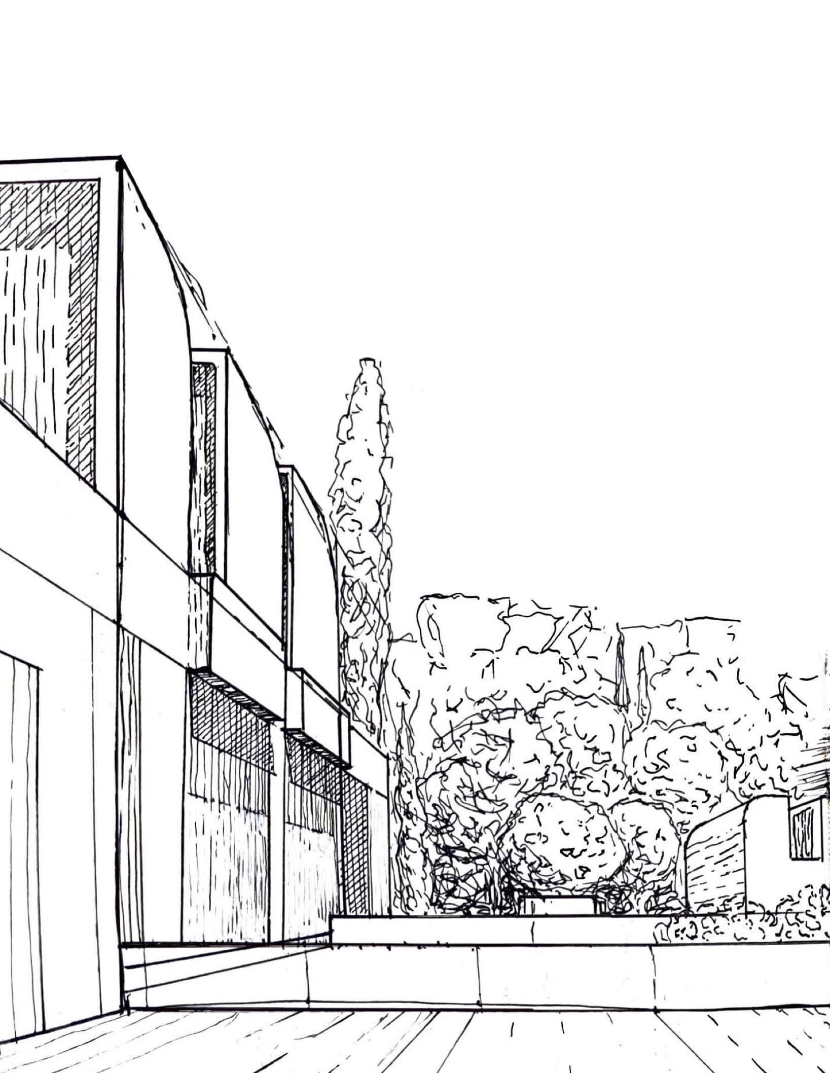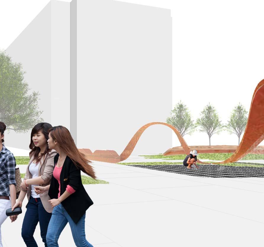 Given the numerous height variations within the new feature, this sectional analysis emphasizes the proportions relative to human interaction and accessibility. Bench seating provides a convenient spot for rest, leading to the central archway, which serves as a gateway to the central space. Beyond this, the ribbon-like opening functions as a screen between pathways, extending outward toward the street and the downtown area. This sequence is designed to work in reverse as well, creating an inviting path for incoming visitors.