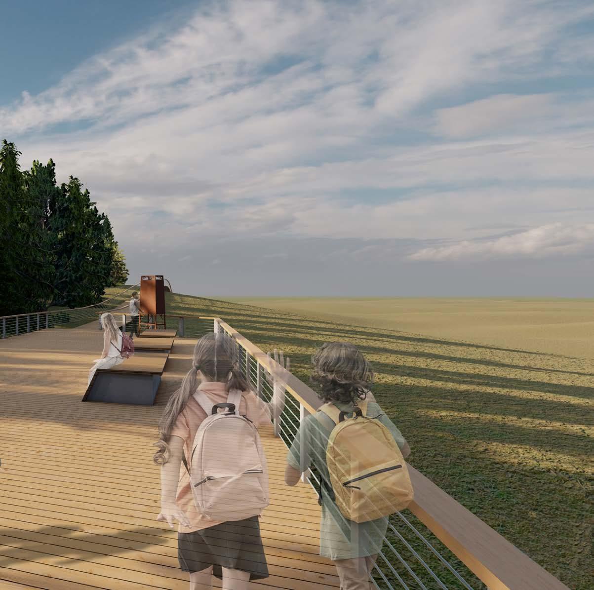 The design of this ADA-accessible boardwalk along the treeline provides three distinct trail experiences, each offering opportunities to observe the surrounding environment and engage with educational points along the route. Though the boardwalk appears linear in plan, its sectional complexity offers users a deeper understanding of Nebraska’s Sandhills topography. By minimizing land development, the project preserves the natural habitat, allowing wildlife to roam freely while offering visitors a safe and elevated vantage point for observation.