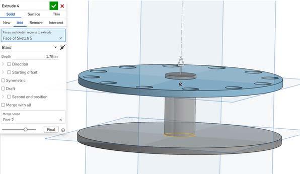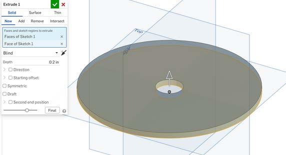 Forthetoppart(therotatingsection),sketch twoconcentriccircles(oneinsidetheother) andextrudetheareabetweenthemtoform aring.