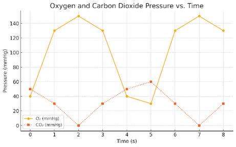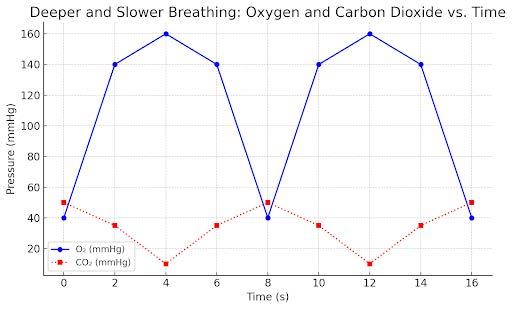 Graph2showsdeeperandslowerbreathscomparedtoGraph1.Theoxygenpeaksarehigher andoccuroverlongertimeintervals,andthecarbondioxidedropsaremorepronounced, indicatingimprovedgasexchangeefficiencywithslowerbreathing.