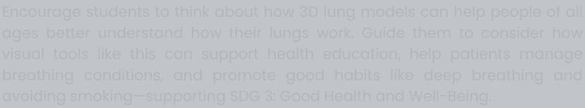 Encouragestudentstothinkabouthow3Dlungmodelscanhelppeopleofall agesbetterunderstandhowtheirlungswork.Guidethemtoconsiderhow visualtoolslikethiscansupporthealtheducation,helppatientsmanage breathingconditions,andpromotegoodhabitslikedeepbreathingand avoidingsmoking—supportingSDG3:GoodHealthandWell-Being.
