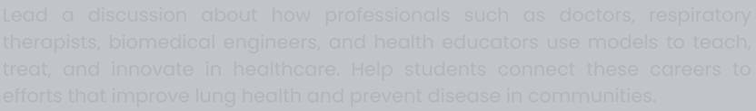 Leadadiscussionabouthowprofessionalssuchasdoctors,respiratory therapists,biomedicalengineers,andhealtheducatorsusemodelstoteach, treat,andinnovateinhealthcare.Helpstudentsconnectthesecareersto effortsthatimprovelunghealthandpreventdiseaseincommunities.