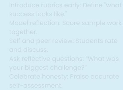 Buildreflectionintotheprocessby askingstudentswhatworkedwell, whatwaschallenging,andwhat theywoulddodifferentlynexttime.