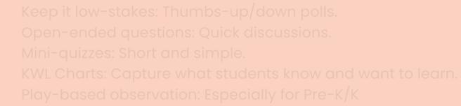 KWLCharts:Capturewhatstudentsknowandwanttolearn. Play-basedobservation:EspeciallyforPre-K/K