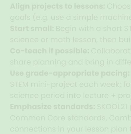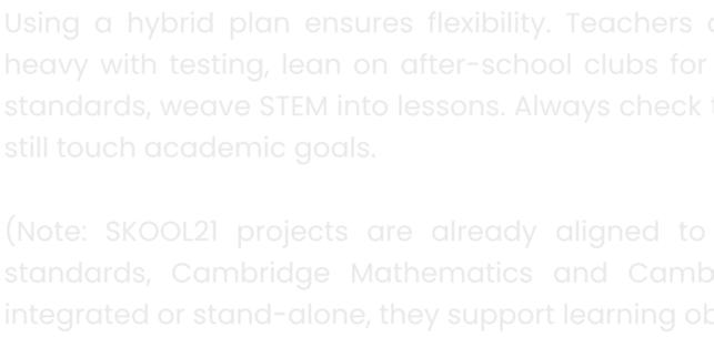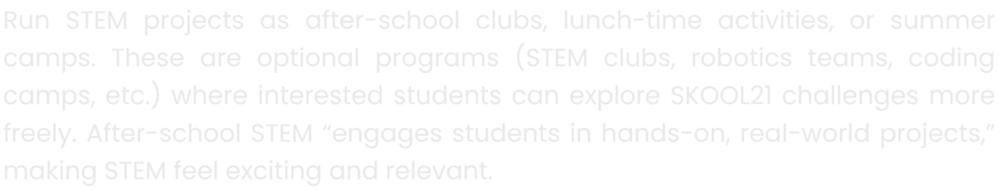 TheSKOOL21STEMprogramalignswithinternationalstandardsandbestpractices, ensuringthatbothteachersandstudentsaredevelopingthecollaboration, innovation,anddesignthinkingskillsvaluedintoday’sworld.You’renotjust supportingschoolwork—you’repreparingthenextgenerationofthinkers,leaders, andchangemakers.