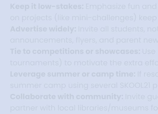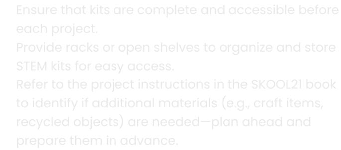 RefertotheprojectinstructionsintheSKOOL21book toidentifyifadditionalmaterials(e.g.,craftitems, recycledobjects)areneeded—planaheadand preparetheminadvance.