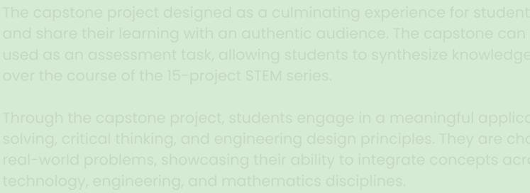 Thecapstoneprojectdesignedasaculminatingexperienceforstudentstodemonstrate andsharetheirlearningwithanauthenticaudience.Thecapstonecanbeconsideredand usedasanassessmenttask,allowingstudentstosynthesizeknowledgeandskillsdeveloped overthecourseofthe15-projectSTEMseries.