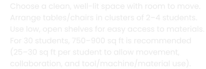 Chooseaclean,well-litspacewithroomtomove. Arrangetables/chairsinclustersof2–4students. Uselow,openshelvesforeasyaccesstomaterials. For30students,750–900sqftisrecommended (25–30sqftperstudenttoallowmovement, collaboration,andtool/machine/materialuse).