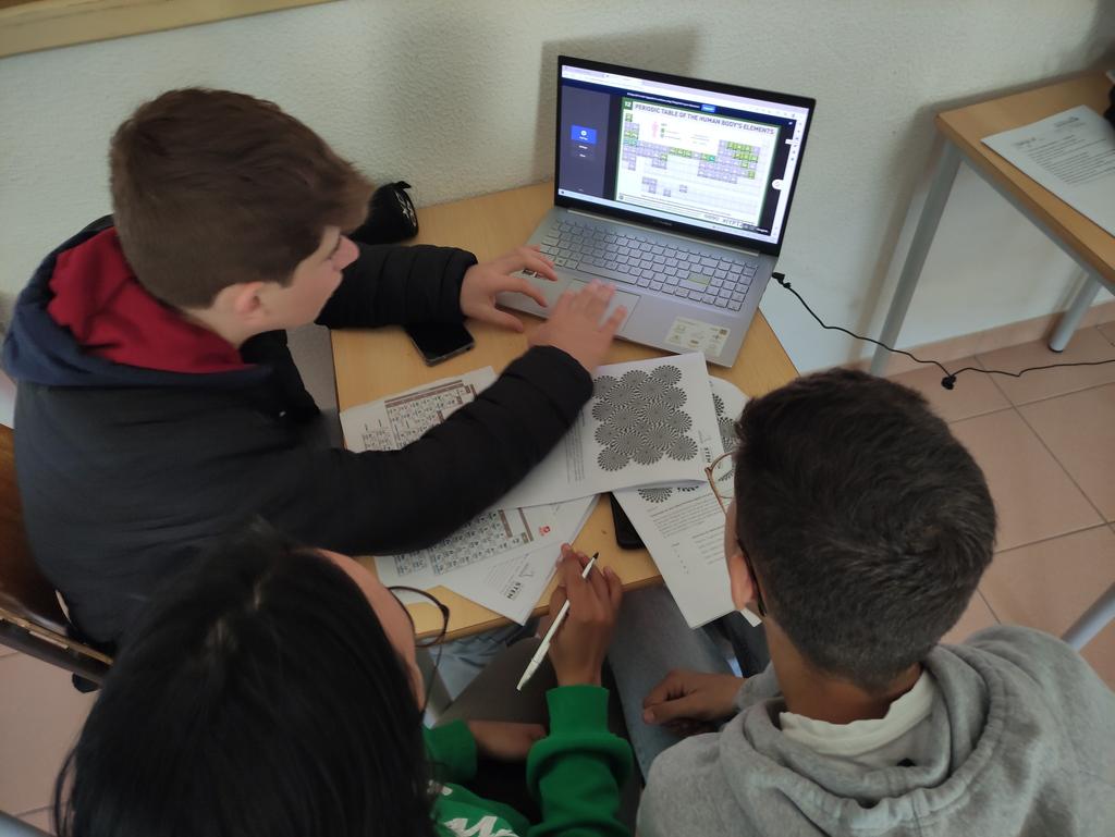 No âmbito da FQ, os alunos realizaram tarefas relacionadas com a importância da tabela periódica, com recurso a uma ferramenta digital chamada ThingLink (https://www thinglink com/pt/), investigando alguns elementos essenciais para o funcionamento dos diferentes sistemas do corpo humano (exemplos: potássio, sódio, cloro ) e partilhando a informação recolhida através da criação de uma página web no telegra ph