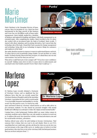 Marlena Lopez Dr Marlena Lopez recently obtained a Doctorate of Veterinary Science and so significant has her influence been, that she was recently named the Veterinary Business Thought Leader by the Australian Veterinary Association for her work in social media “I was incredibly honoured and humbled to win the award. Over the past few years, I’ve tried to be really open and honest about my veterinary school journey as well as offer advice to pre-veterinary students. I’ve also shared my personal struggles with mental health and wellbeing in an attempt to reduce the stigma around mental health.” Coming from a Latin background, Marlena didn’t see many Latina women in veterinary medicine and so didn’t have any role models or mentors to reach out to. To address this need, she started her website, veterinaryadventures.com and her social media veterinary_adventures. Marlena offered some advice for girls looking to become veterinarians, “find someone that is doing what you want to do and shadow them to see if it’s something that you would enjoy and also ask them for what you can do, how you can best prepare at the stage of life you’re at. Another piece of advice is to find good mentors, they don’t have to be in the veterinary field, but find good mentors that you can learn and grow from.” FEB/MAR 2021