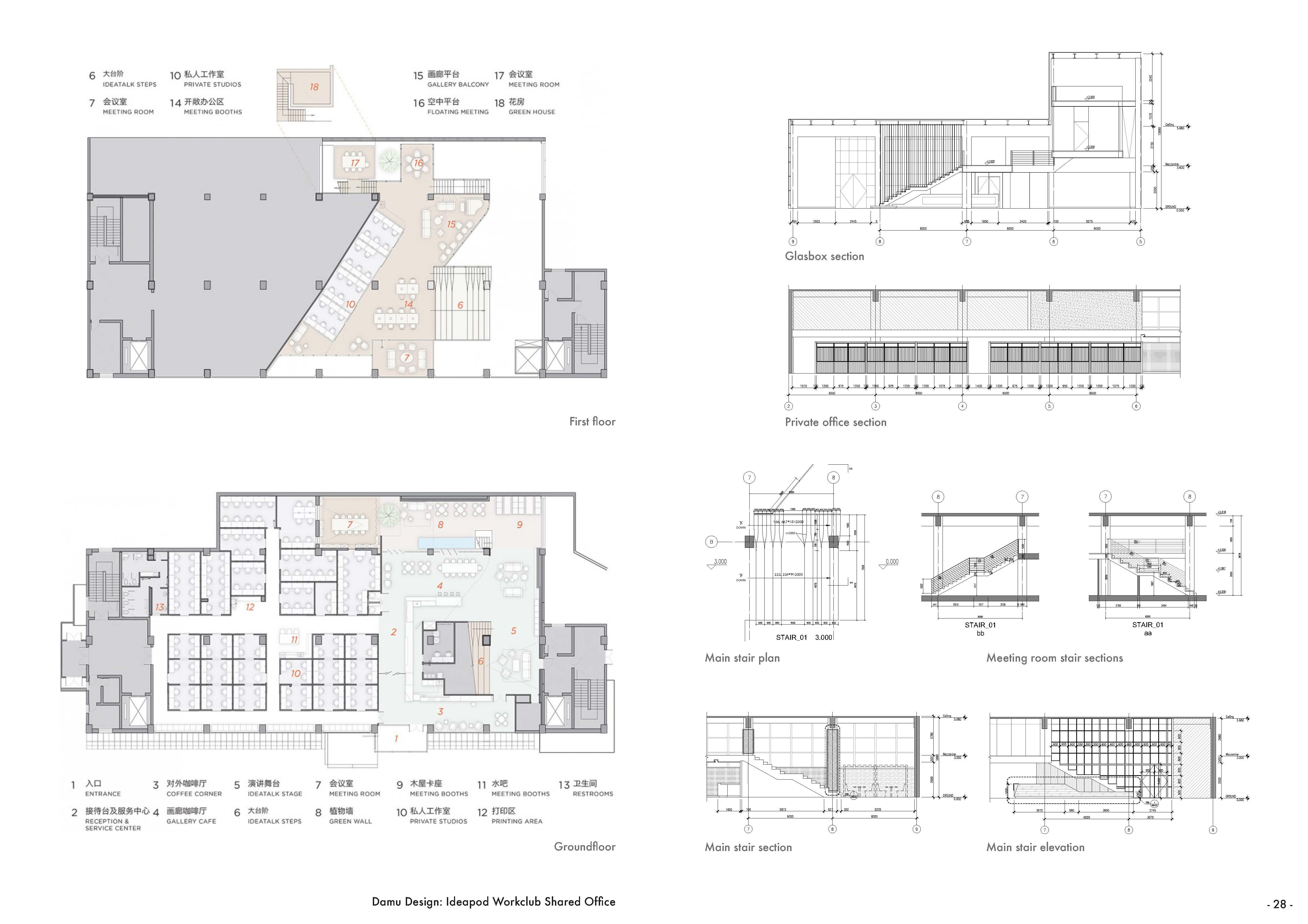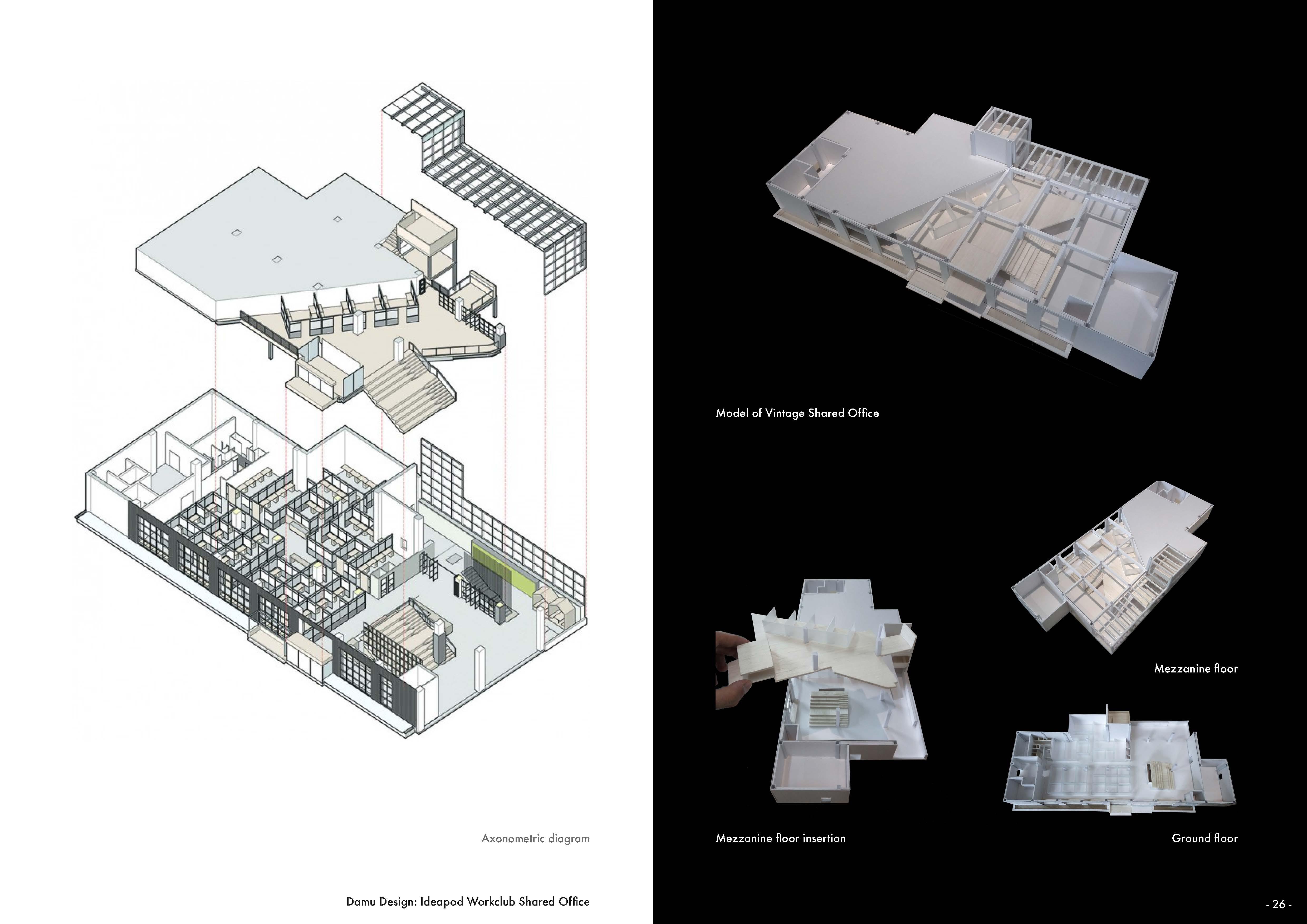 We did together the first phases of design of the “Ideapod Shared Office” until the final concept design and the construction started. The main design decision was to create more room for the many necessary desks by placing a minimaly supported, folded and wooden second level in the double hight area. The walls of the rentable office spaces are made of prefabricated modular elements for an easy assembling regarding the tight timeframe.