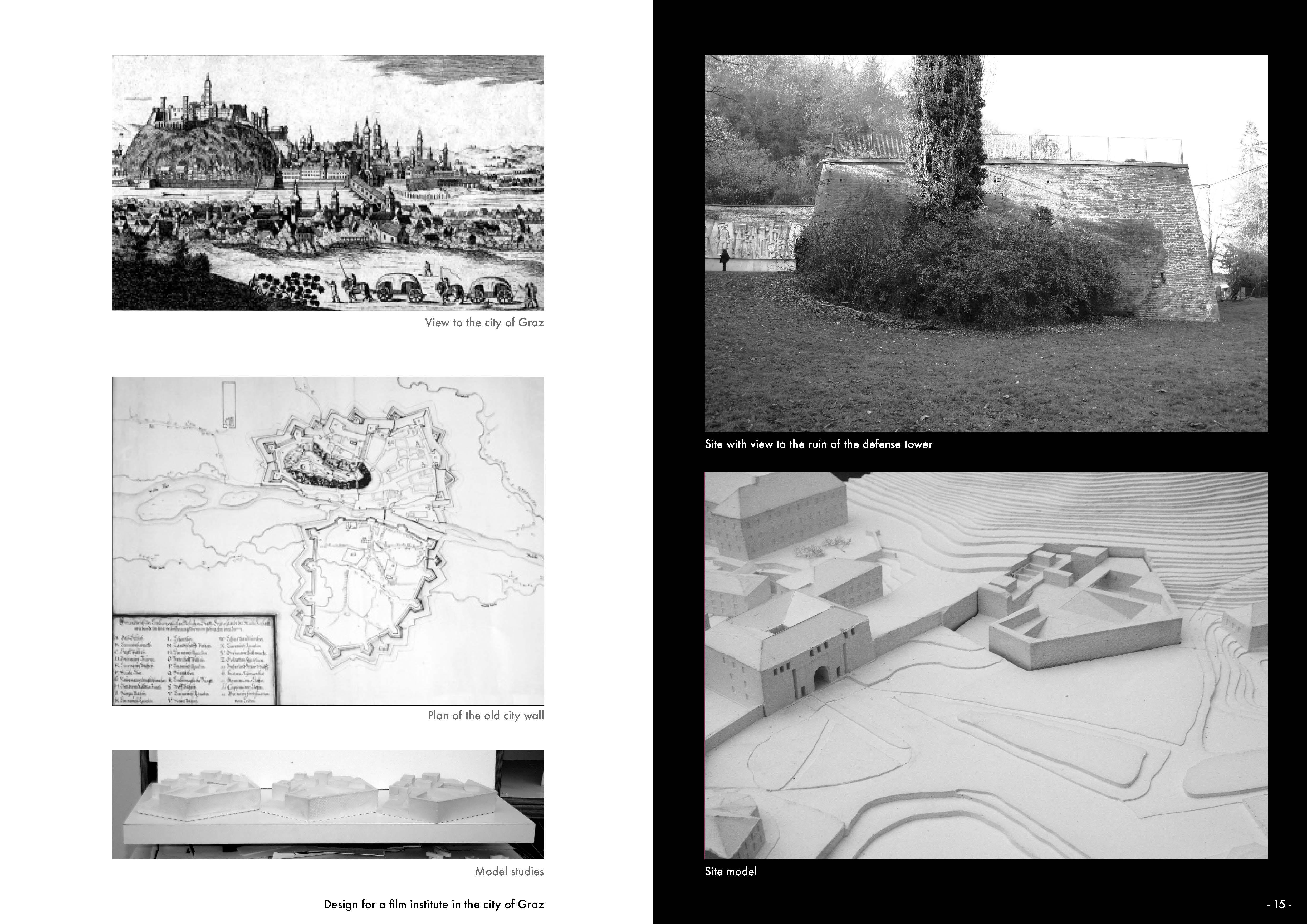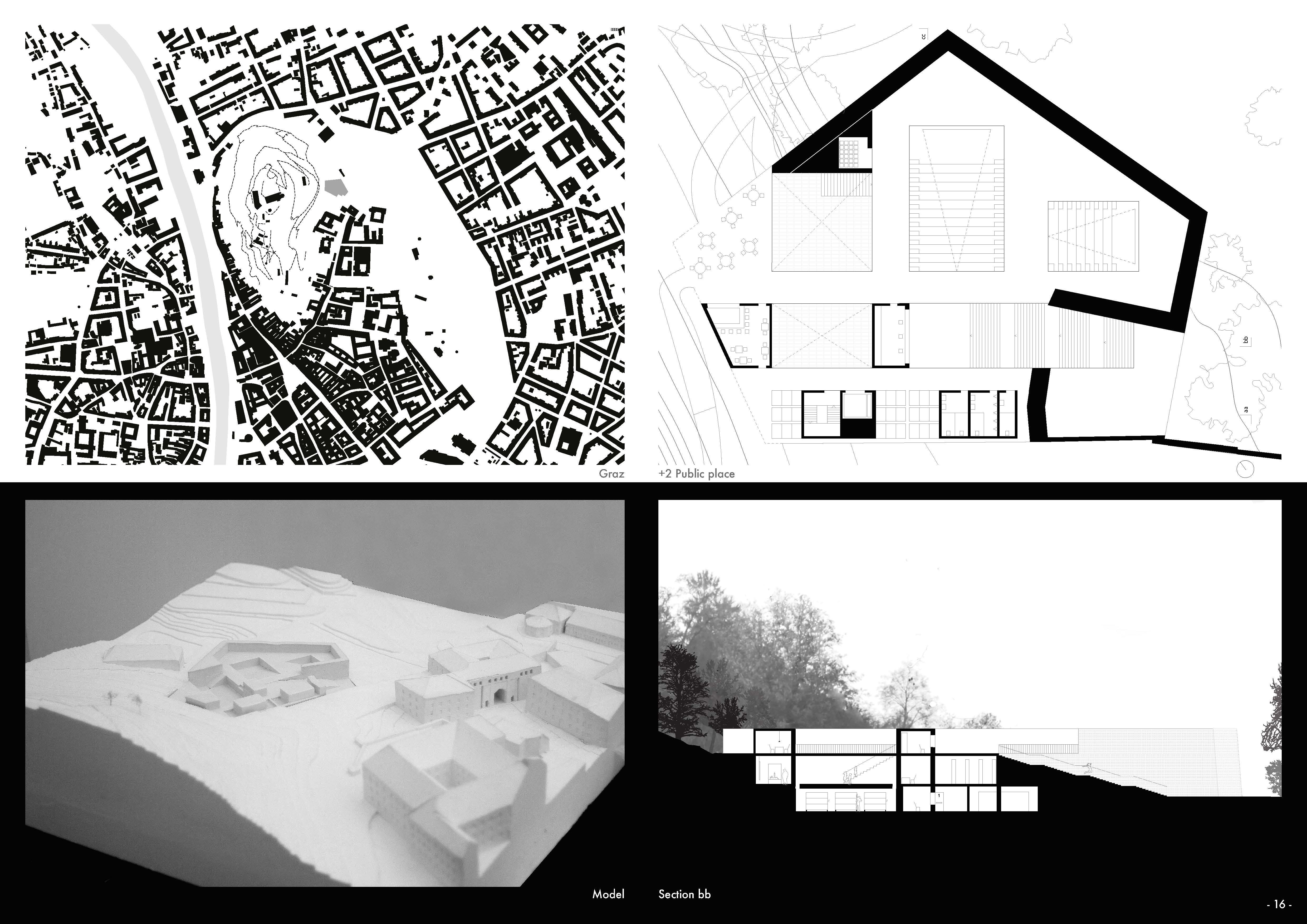 This is a concept design for a contemporary cultural center for the production, research, communication and exhibition of film on a plot at the fortress wall next to the Paulusgate in Graz (Austria). The building serves as a public space with two open air cinemas for the summer, a café and an access to the courtyard of the library. The new route to the Schlossberg runs over the building and makes it one resting place for passersby.