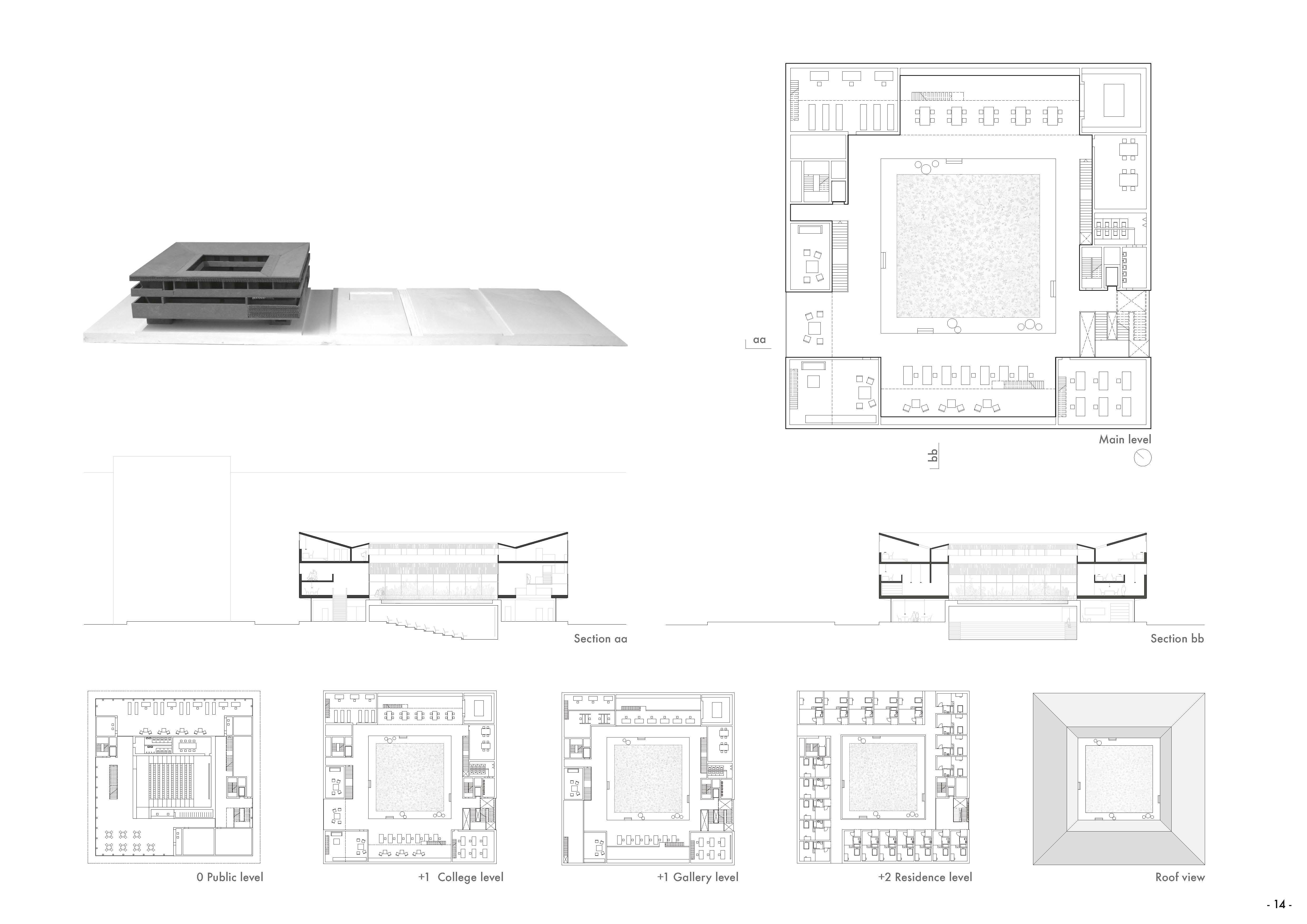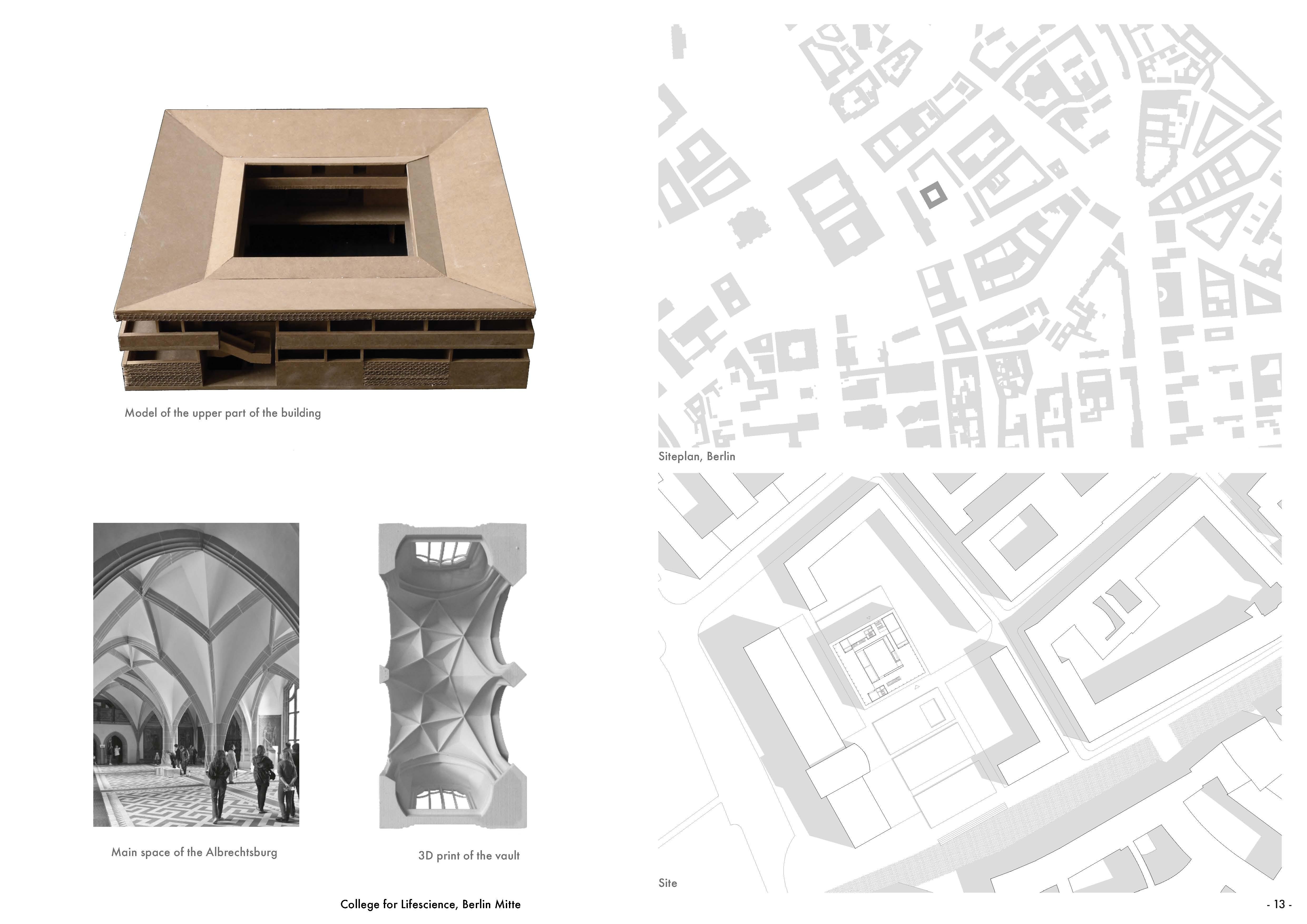We started by analyzeing gothic and baroque vaults in Saxony, Bavaria and the Czech Republic and digitally remodeled them subsequently. Afterwards we compared the results with reality on a field trip. With the gained knowledge we have designed a knowledge-community college for life science studies in Berlin, near the Berliner Schloss. It has been projeted to host a selection of forty Fellows. The goal was to create a place beyond academic institutions that offers a forum for contemplation and research. The main focus of the design was a new interpretation of the cloister in order to make the college floor a communication center and meeting place. The cloistered courtyard opens up to various rooms and constitutes the hub for the private path of the Fellows and the visitors of the lecture hall and the salón.