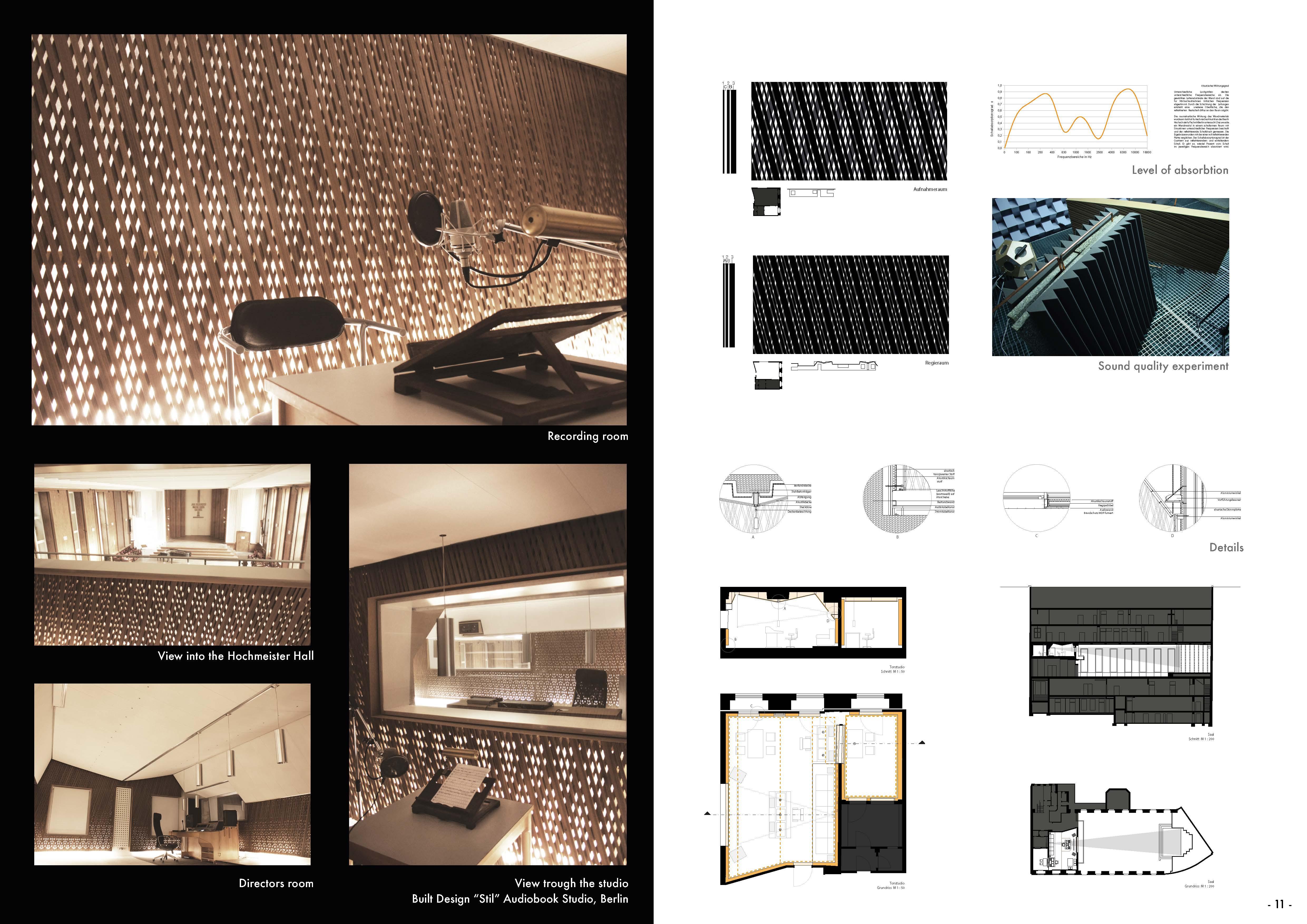 For this independent project we designed and built the interior of a recording studio for voice recording. It is located in the parish hall of the Hochmeiser Community in Charlottenburg, next to the Hochmeister Hall. The project refers to a surface design task from Prof. Dr. Palz in the winter semester 2012/13. It examines its acoustic and lightening potentials in the framework of a real recording studio operation. We designed the room panelling to constitute a visually homogeneous element that adds technical and atmospheric qualities to the room. Thereby it has been possible to flood normally dark interiour spaces with diffuse light similar to shadows in a forest.
