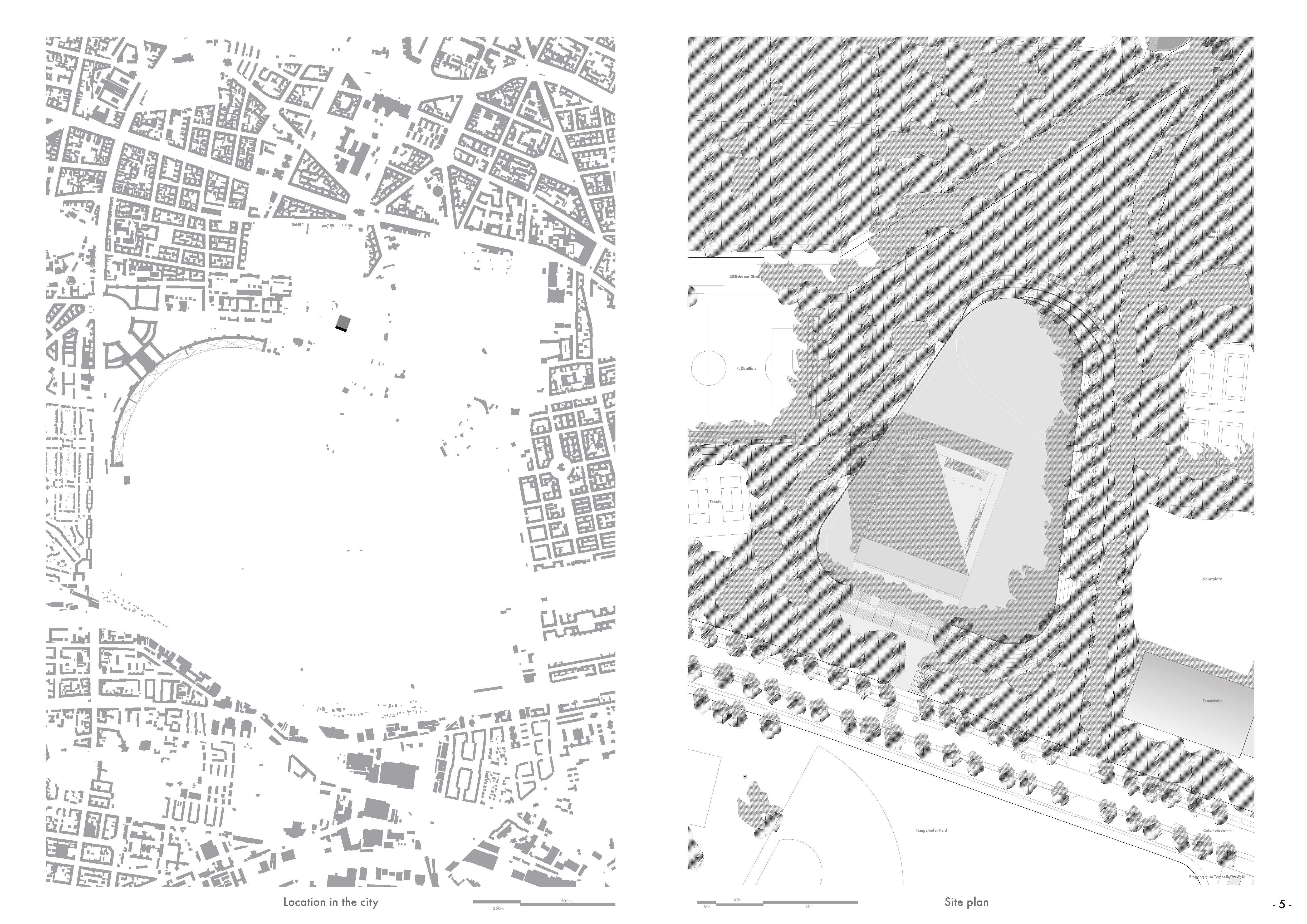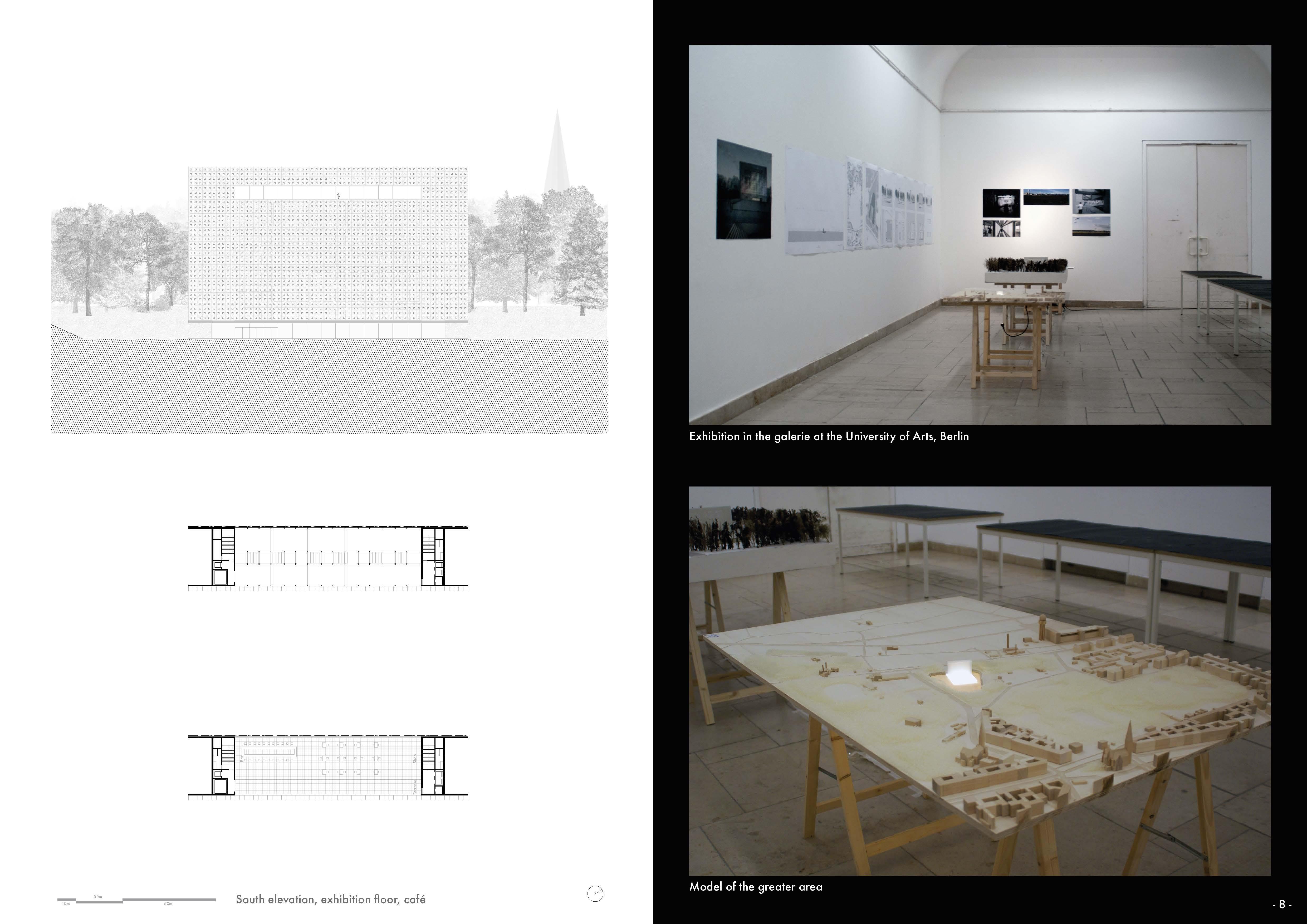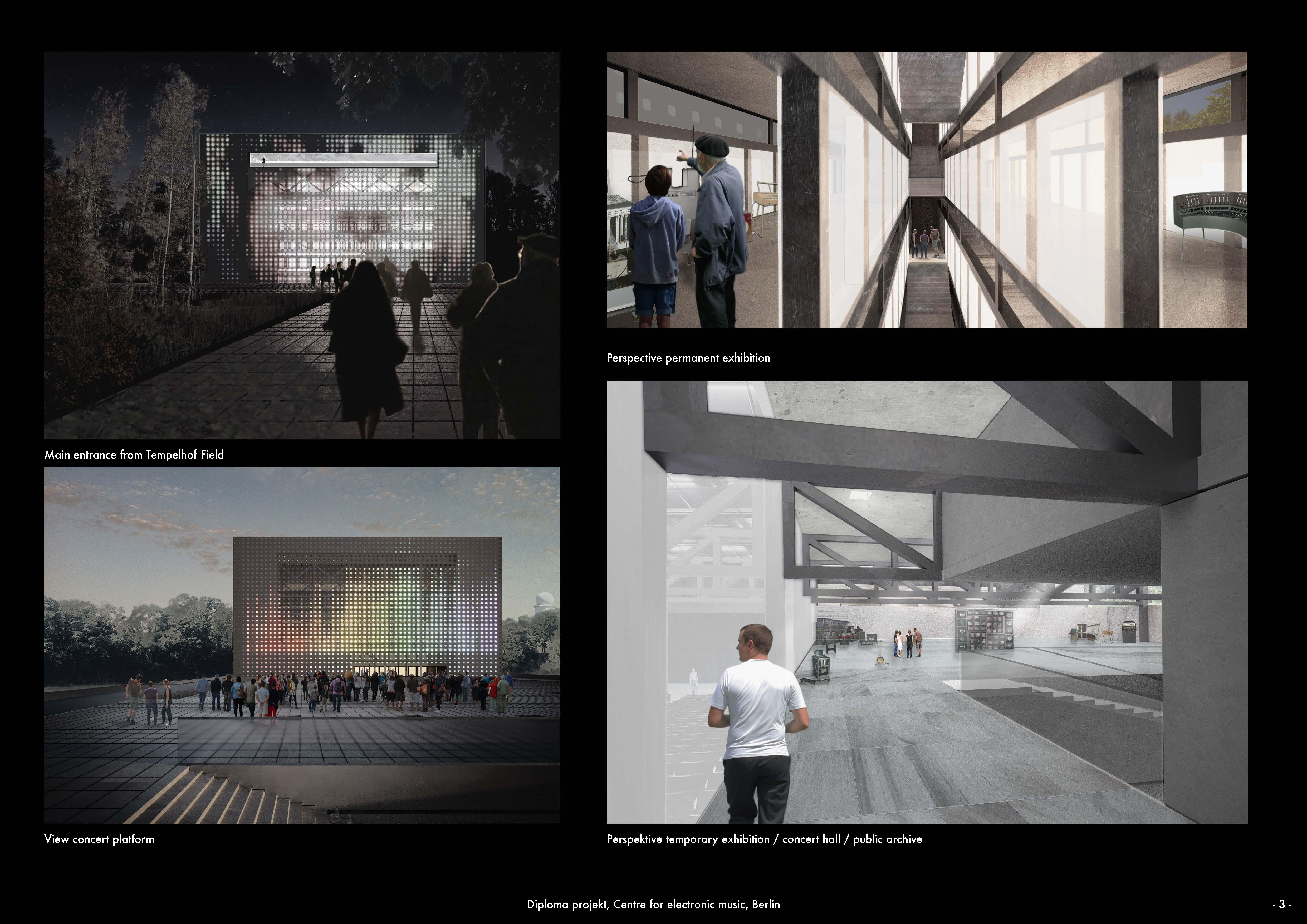 In my diploma project I designed a cultural center for electronic music in Berlin. The site is situated in the north of Tempelhof Field in the old rainwater collection basin of the airport. It is meant to be a place for collecting, exhibiting and performing electronic music culture. For me it was of special importance that the building has no representative and dominant position in the city but a clear, uncompromising form. Towards Tempelhof Field the building has a media facade which adds a new dimension to the skyline of Berlin. It is going to attract visitors who might pass by after closing the field in the evening hours. The terrain lies 7m lower than the surrounding and is separated from neighbouring areas by a dense belt of trees. These prerequisites function as a sufficient acoustic screen. The roof of the lower level of the building provides space for up to 15000 visitors and is a stage for musical performances. It is situated in front of a reactive fassade which allows the architecture to respond to the music.