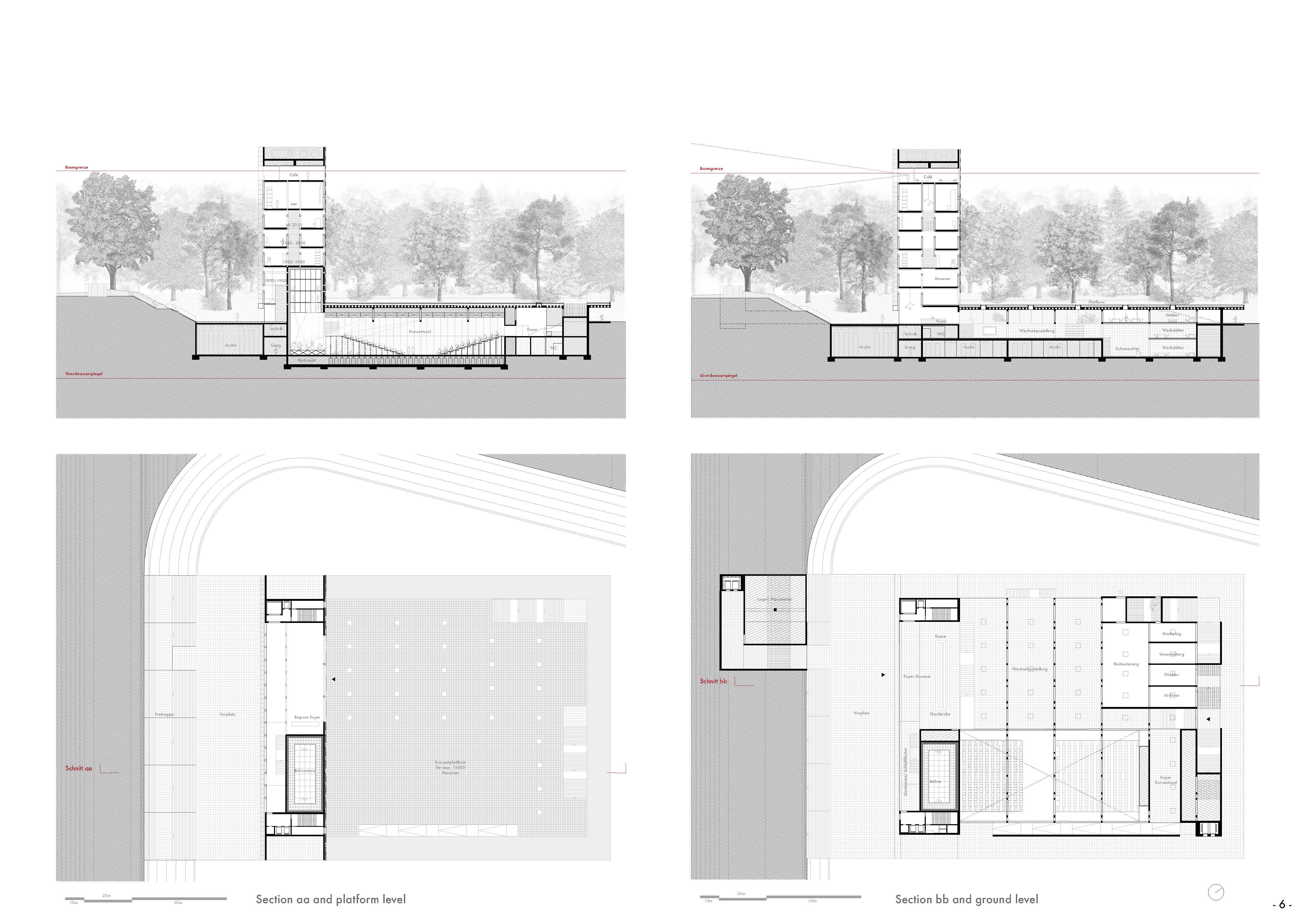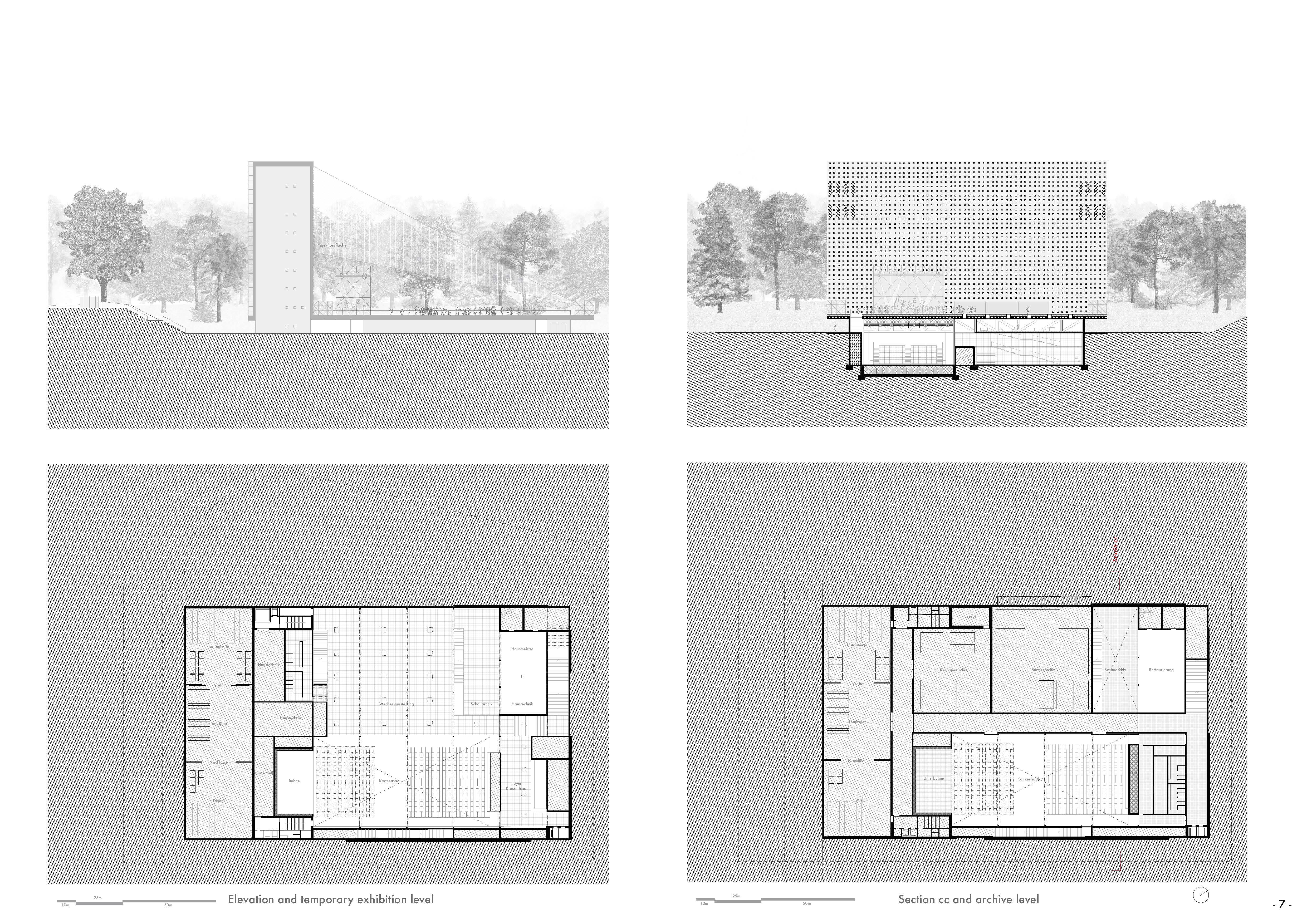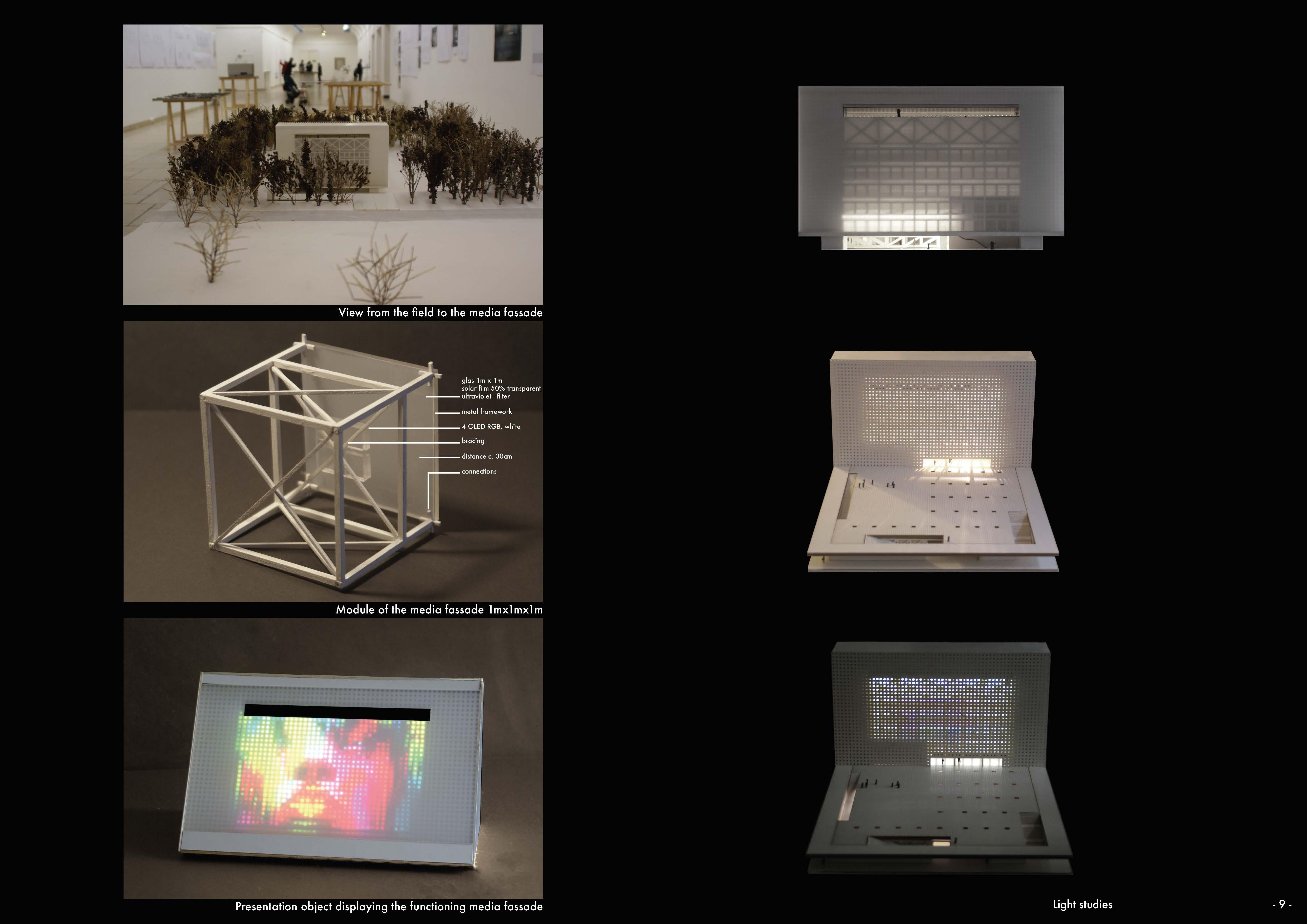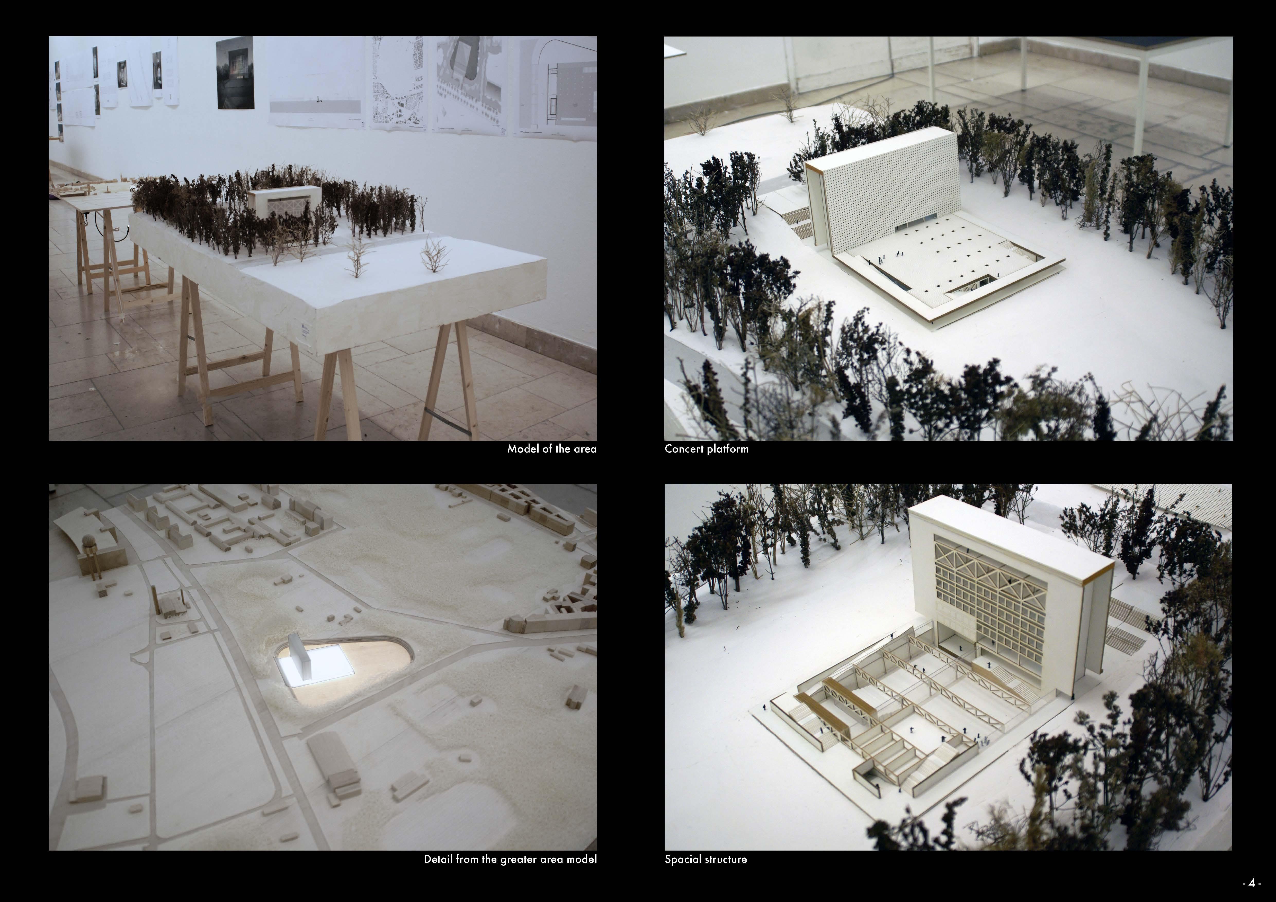 In my diploma project I designed a cultural center for electronic music in Berlin. The site is situated in the north of Tempelhof Field in the old rainwater collection basin of the airport. It is meant to be a place for collecting, exhibiting and performing electronic music culture. For me it was of special importance that the building has no representative and dominant position in the city but a clear, uncompromising form. Towards Tempelhof Field the building has a media facade which adds a new dimension to the skyline of Berlin. It is going to attract visitors who might pass by after closing the field in the evening hours. The terrain lies 7m lower than the surrounding and is separated from neighbouring areas by a dense belt of trees. These prerequisites function as a sufficient acoustic screen. The roof of the lower level of the building provides space for up to 15000 visitors and is a stage for musical performances. It is situated in front of a reactive fassade which allows the architecture to respond to the music.