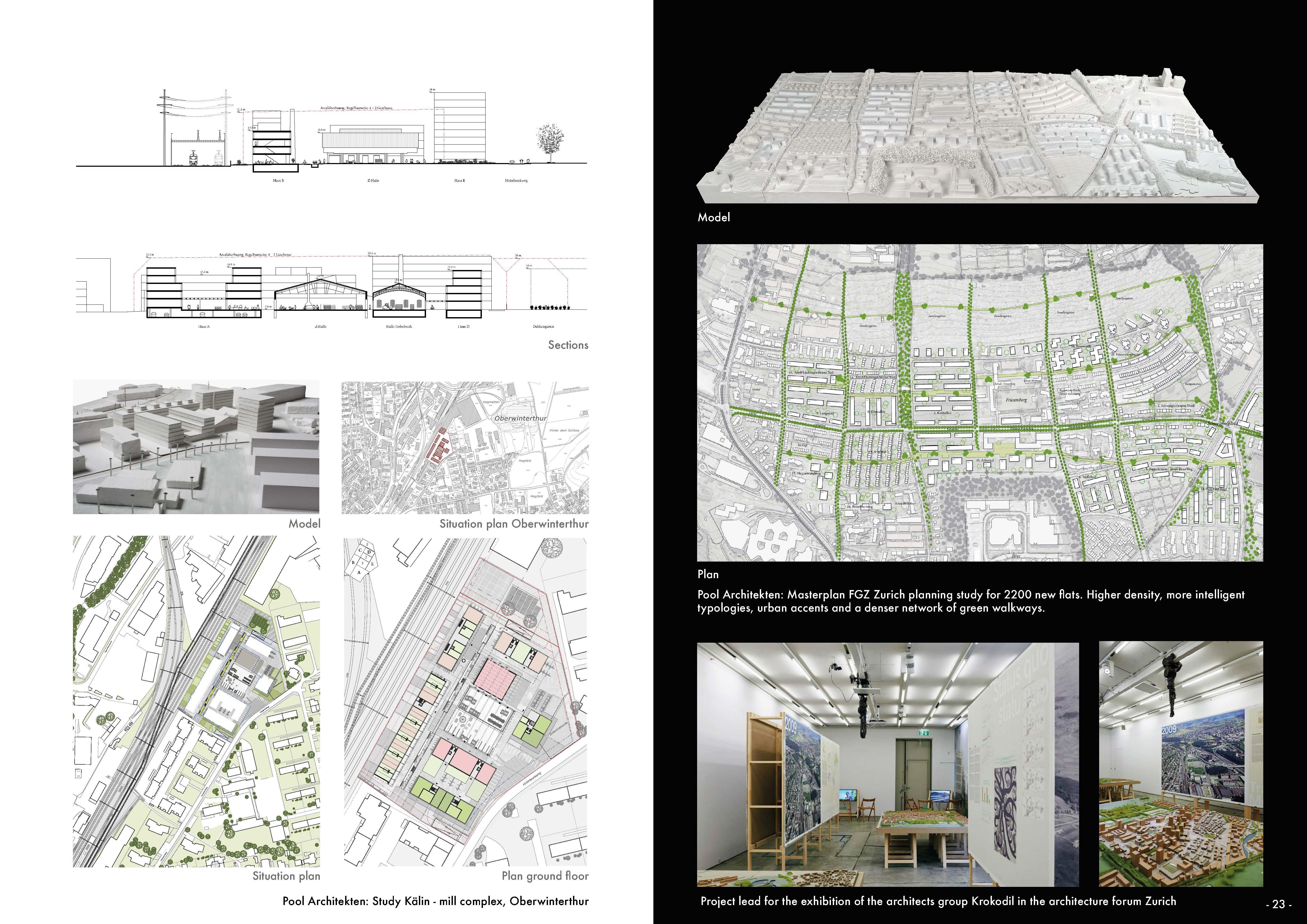 During the internship I worked for detailing in all scales and also in the competition team. I participated in a master plan for 2200 new flats in Zürich and in a renewing plan for a former industrial areal with a mixed housing and commerce plan . Finally, I was responsible for the planning of the exhibition of the architects group “Kokodil“ in the “Architektur Forum” Zurich .