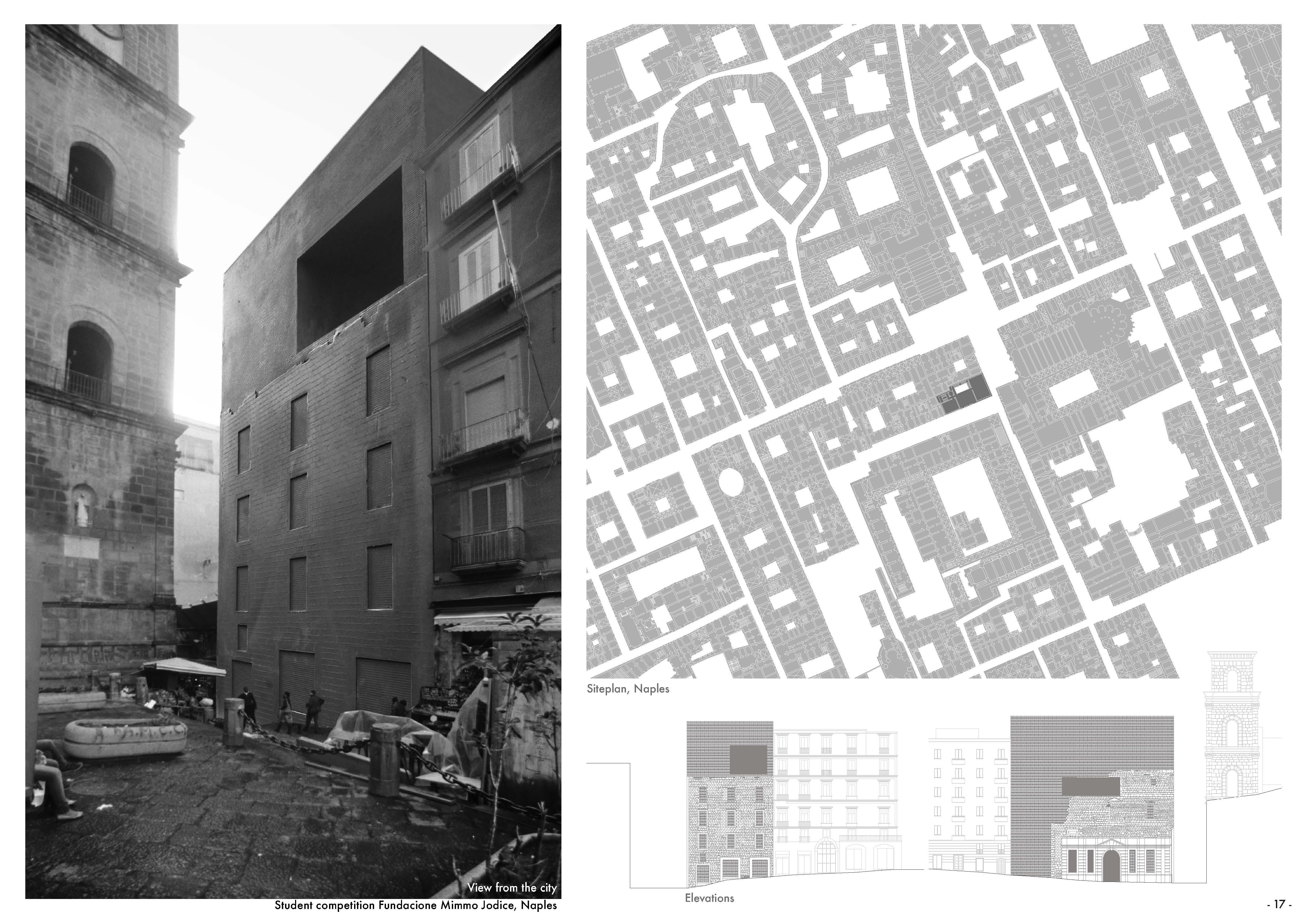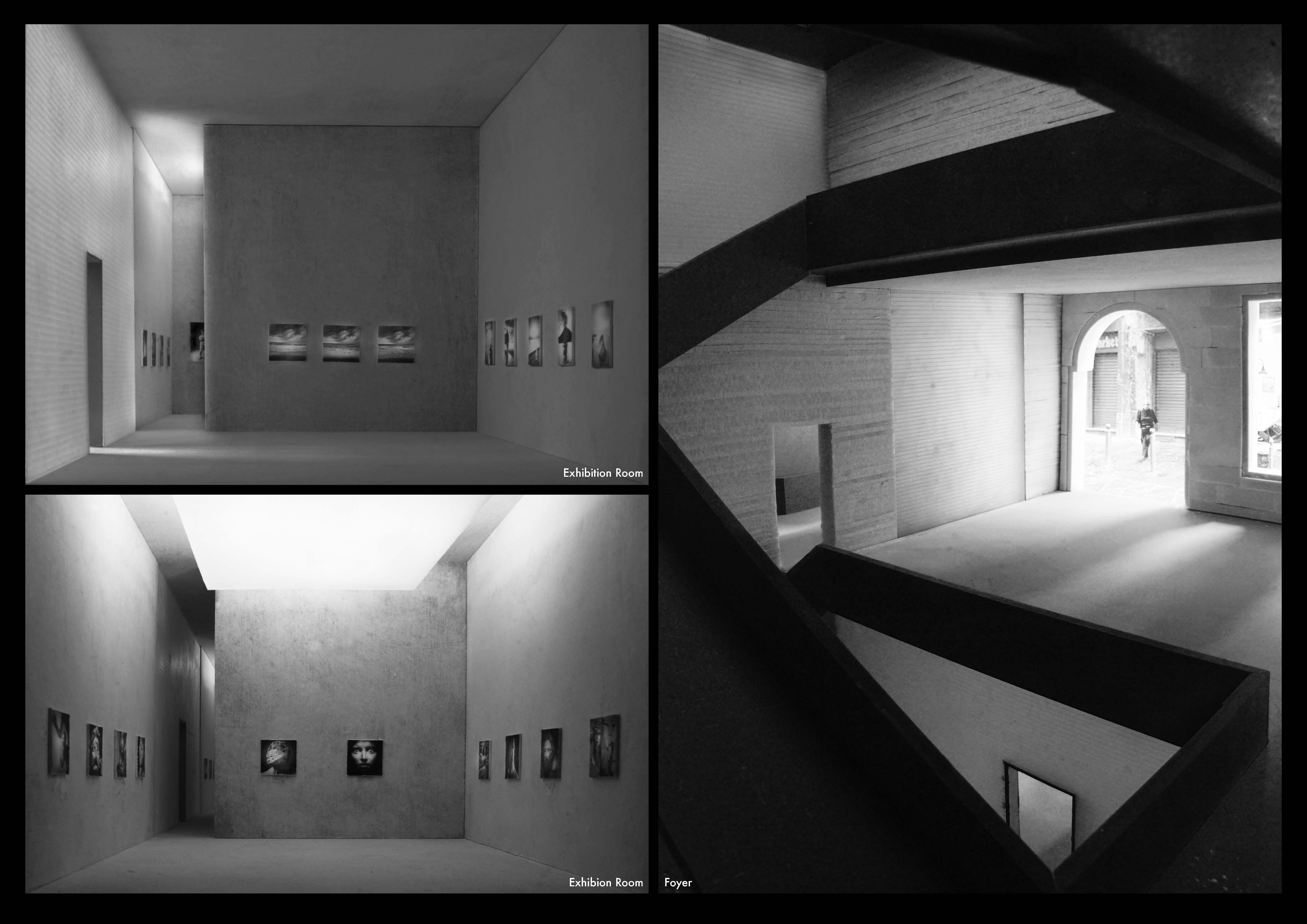This is the design for a building for the “Fondazione Jodice” in Naples. It was created as part of a student competition under Prof. Krischanitz. It represents a building that includes several exhibition spaces the permanent exhibition of the photographs of Mimmo Jodice, a temporary exhibition space, a cafe, a photo lab, offices and a larger archive. The design is based on the theme “time”. The existing ruin of the old building is integrated in the new design just like Mimmo Jodice inculdes his antique discoveries in his pictures. The building has four large openings that allow different views to the city while the interiour spaces are mainly artificially illuminated to fit the needs of fotographic exhibitions. Air flows through the big openings make the visitors constantly feel the climate of South Italy on their way through the exhibition.