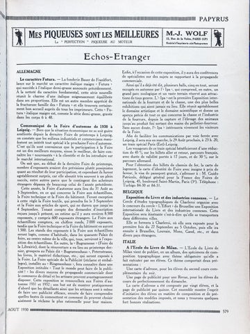 E c h o s -E tr a n g e r ALLEMAGNE Le caractère Futura. — La fonderi e Bauer de Frankf ort, lance sur le marché un caractère italique maigre « Futu ra » qui succède à l’italique demi-gra sse annoncée précédem ment. A la netteté du caractère fondam ental, cette série nouvelle réuni t le charme d’une italique soigneusem ent équilibr ée dans ses propo rtions . Elle est un autre membre apprécié de la fru ctueus e famille des « Fut ura » et elle t rouvera certaine ment bon accueil auprè s de tous les im prime urs. Cette « Fu tura » i talique maigre est, comme la série demi-grasse, gravée dans les corps 6 à 48. Communiqué de la Foire d’automne de 1930 à Leipzig. Bien que la situat ion économiq ue ne se soit guè re améliorée depuis la dern ière Foire de printe mps à Leipzig, on consta te que les mili eux indust riels et commerciaux mani festent un inté rêt tout spécial à la prochain e Foire d’automne. C est qu ils sont convaincus que la partic ipati on à la Foire est un des meilleurs moyens, sinon le meilleur, de faire c on naître les « nouveau tés » à la cl ientèle et de les in trodui re sur le marché intern ationa l. On sait que, au déb ut de la dern ière Foire de printemp s, nombre d’exposants avaient des prévisions plutô t pessimistes quan t au ré sulta t de leur partic ipatio n, et c ependa nt ils furent agréabl ement surpr is, car elle a bout it très souvent à un plein succès, entre autres parce que le conting ent des acheteurs étrange rs dépassa de beaucoup celui de l’année précédente. Cette année, la Foire d ’autom ne aura lieu du 31 Août au 5 Septem bre, en ce qui concerne la Foire aux échantillons, la Foire techn ique et la Foire du bâtime nt. Feront exception à cette règle la Foire textile, qui pren dra fin le 3 Septe mbre et la Foire aux articles de sport , qui ne durera que jusq u’au 4 Septem bre. Ten ant compte des demand es d’inscription reçues jus qu’à présent, on estime qu ’il y aura environ 8.500 exposants, y compris 600 exposants étrange rs. La Foire aux échantillons comptera, en chiffres ronds, 7.000 exposants, tandis que la Foire tec hniqu e et la Fo ire du bâtim ent en auro nt 1.500. Les stands des exposants à la Foire aux échantillons seront logés, comme d’habitude, dans les quara nte Palais de foire, au centre même de la ville, qui, tou s, serviron t à l’expo sition des écha ntillons. En outre, la « Bugramesse » (Foire de la Li brairie), dont la réou verture a eu lieu au printe mps der nier, groupera au Palais dit « Bugramesshaus », Petersstrasse , les livres, le matériel didactiq ue, etc., qui seront exposés à la Foire. La Foire spéciale de la Publicité (réclame et embal lages), installée au « Ringmesshaus », fera connaître dans une Exposition intitulée « Tou t le monde peut faire de la publ i cité ! » les divers moyens de propagande commerciale dont le commerce de déta il et les artisans peuvent avantageuseme nt disposer. Cette exposition se renouvellera aux Foires d’au tomne 1931 et 1932; son but est de montr er pratiq uemen t d abord que les détaillant s ainsi que les artisans sont à même de faire une publicité efficace, ensuite de faire compre ndre quelles fautes ils com mettent et comment ils pe uvent choisir aisément la réclame la plus rationnell e pour leur maison.