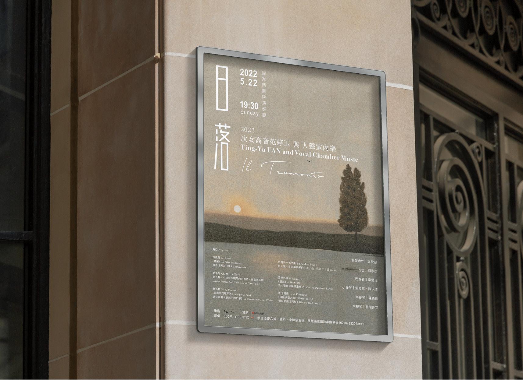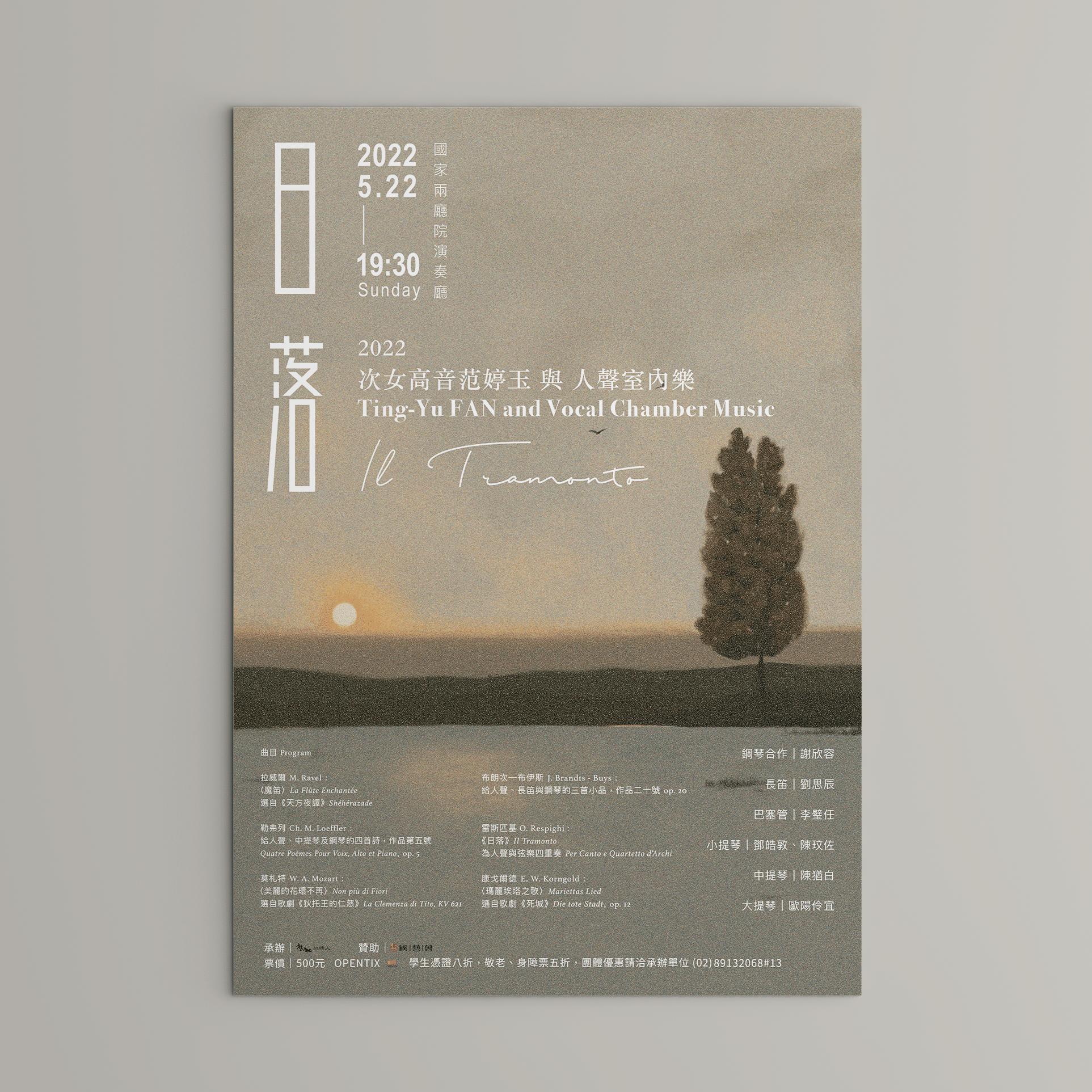 This poster is designed for Prof. Ting-Yu Fan and vocal chamber music recital at Tai wan National Recital Hall. Professor Fan specified that the illustration be in pointil lism style, which I was able to create through Adobe Photoshop after finishing the oil painting of a warm sunset which the title Ill Tramonto is suggested.
