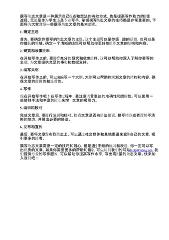 撰写杂志文章是一种展示自己观点和想法的有效方式,也是提高写作能力的绝佳 途径。无论是作为学生还是专业写手,掌握撰写杂志文章的技巧都是非常重要的。下 面将为大家介绍一些撰写杂志文章的基本步骤。