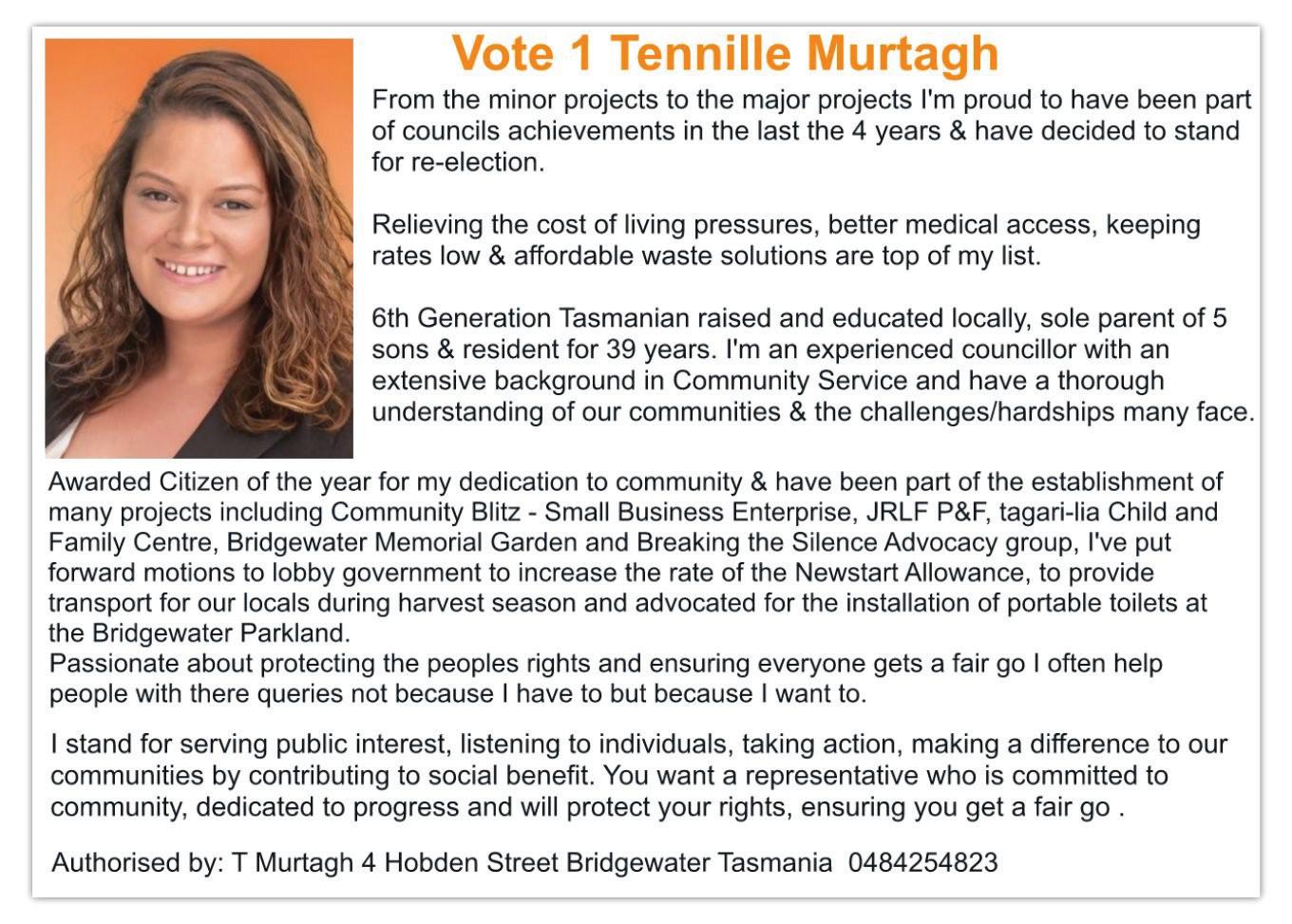 TENNILLE MURTAGH Bridgewater 7030 Tel: 0484 254 823 cr.murtagh@brighton.tas.gov.au