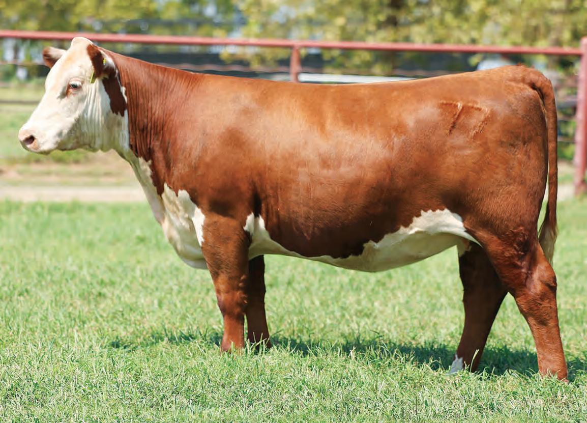 9226 was the first naturalborn calf out of 7098 and sold as Lot 3A in the Inaugural Big League Genetics Sale to Atkins Herefords and Hoffman Ranch for $16,000. While serving as a donor for Atkins and Hoffman, she produced more than $150,000 in total sales. This featured donor is currently working in the Stellpflug Cattle Co. program. In their inaugural female sale, three daughters totaled $32,500.