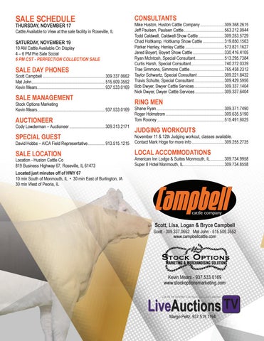 Mike Huston, Huston Cattle Company.......................309.368.2615 Jeff Paulsen, Paulsen Cattle......................................563.212.9944 Todd Caldwell, Caldwell Show Cattle.........................309.253.5729 Chad Holtkamp, Holtkamp Show Cattle.....................319.850.1563 Parker Henley, Henley Cattle.....................................573.821.1627 Jared Boyert, Boyert Show Cattle..............................330.416.4105 Ryan McIntosh, Special Consultant............................513.295.7384 Curtis Harsh, Special Consultant................................740.272.0339 Trae Simmons, Simmons Cattle.................................765.438.2312 Taylor Schwartz, Special Consultant..........................309.221.8432 Travis Schulte, Special Consultant.............................309.429.5956 Bob Dwyer, Dwyer Cattle Services.............................309.337.1404 Nick Dwyer, Dwyer Cattle Services............................309.337.6404