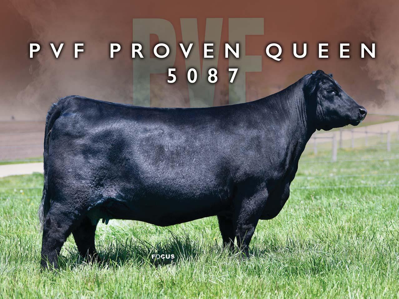 5094, sired by our foundation Genex sire PVF Insight 0129, is a direct daughter of the famous PVF donor, Dameron PVF Proven Queen 010. The 010 by Insight mating has produced numerous champions at the National Junior Angus Show and are proving themselves to be potent producers. Among 5094’s many accomplishments include a $40,000 feature of a past Spring Production Sale. The ABS featured sire, PVF DLX King Pin 0058 generated a tremendous buzz in his first spring in his first calf crop when nine daughters averaged more than $50,000 in our Spring Production Sale. King Pin daughters have been popping up as features in many of the top show heifer sales ever since.