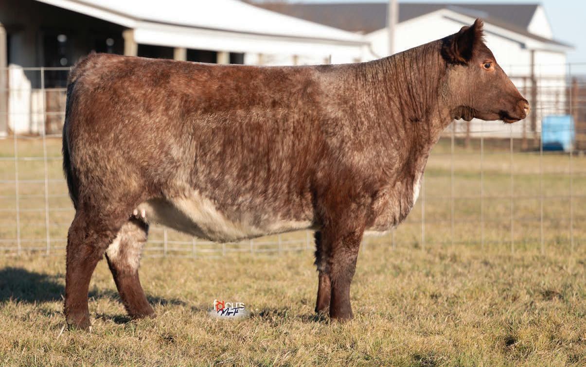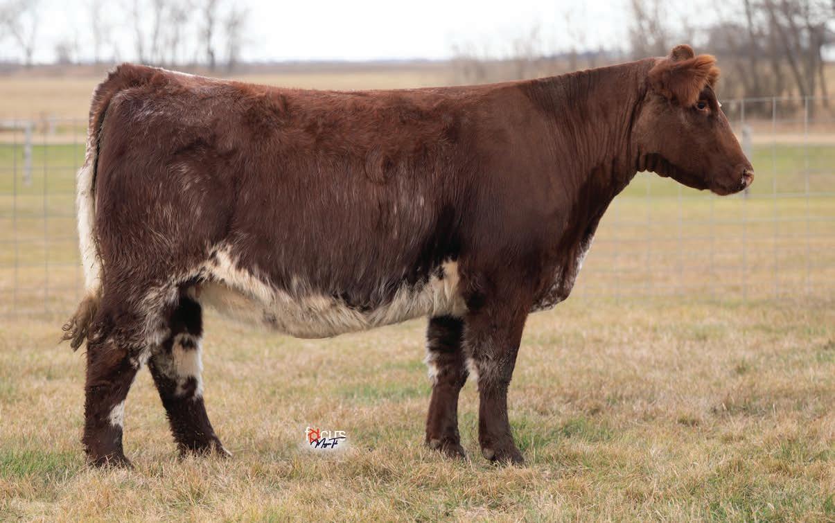 Power and mass are the words that come to mind when describing this female. Extremely square and level, all while flexible in angles. We purchased this female with the goal of adding some more power to the group, and when we made the commitment to offer the top end of the group, she was on the top of that list. Extra bit of chrome for added value, we feel this female can raise both show heifers and show steers that will top sales!