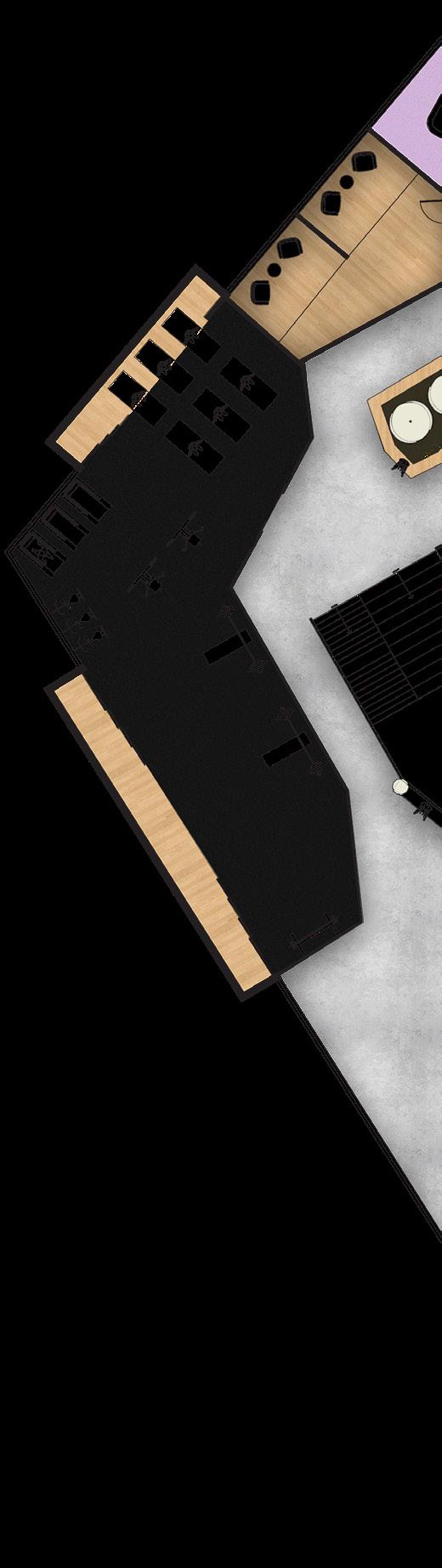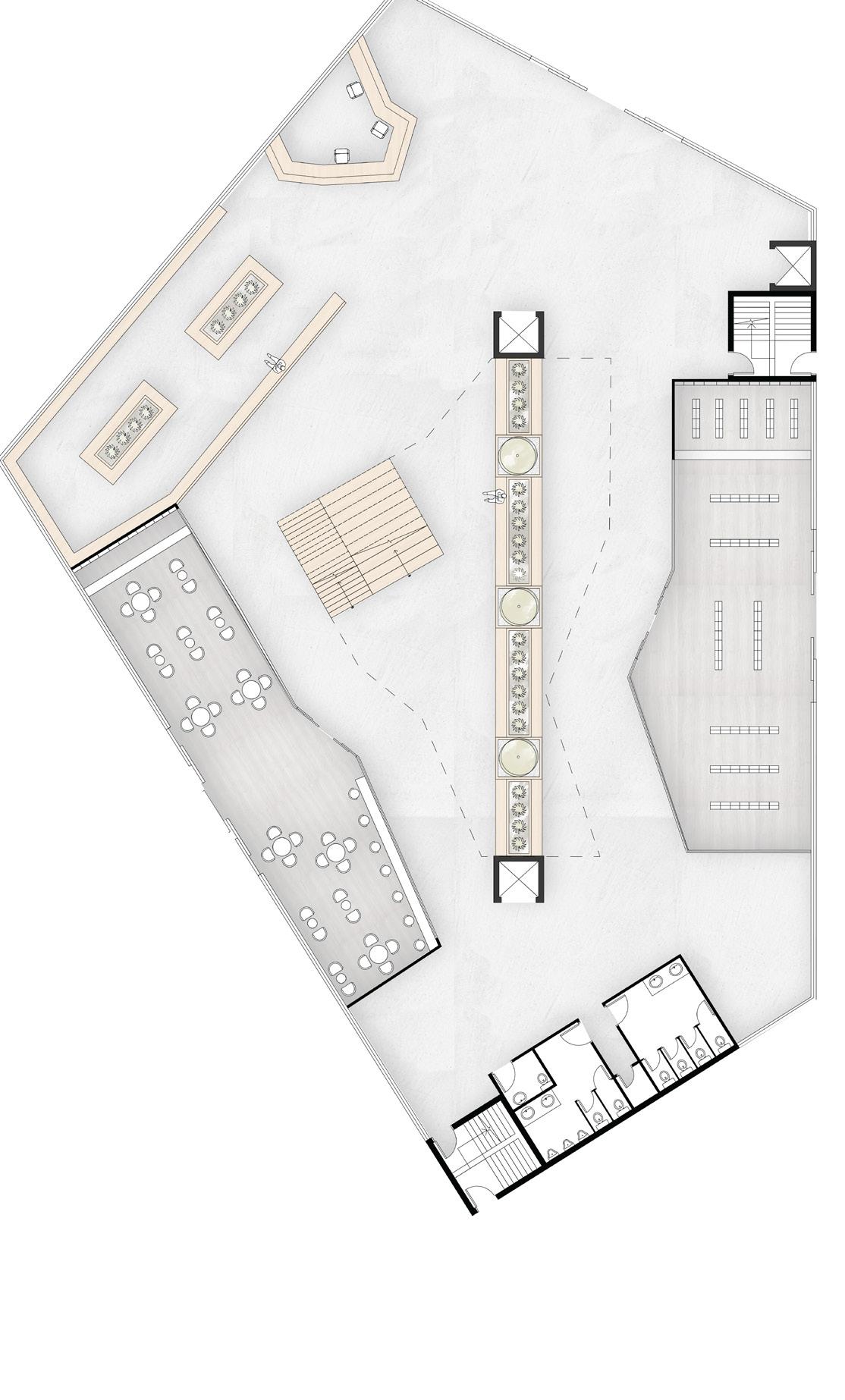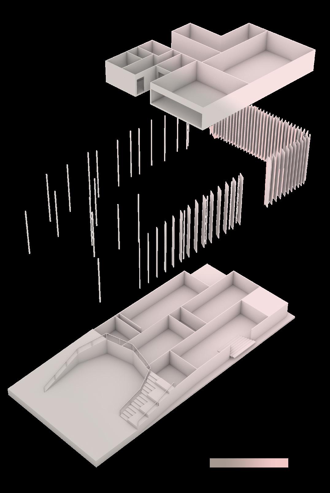 The healthcentre is broken down into 3 groups, where the interaction spaces acts as a glue, binding the wellness and knowledge spaces together, creating cross-programmed spaces within each groups. Moreover, the goal is to have a strong visual and physical axis along the centre in order to have a connection with the site that already has a strong axis.