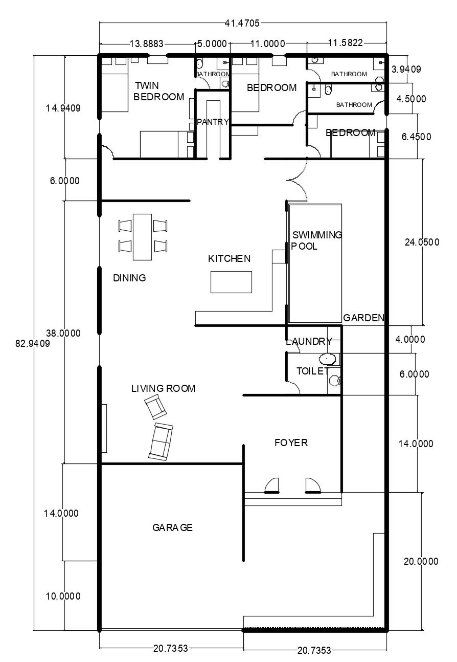 In design 3, there are a total of 12 unique amenities. Upon walking in from the gate, you will be greeted with a garage for your vehicles for easy access to drive and park in the house or drive out of the house. In front of the garage, there is a pathway towards the front entrance and foyer. On the right side of the front entrance is a pathway that leads to the garden and swimming pool This creates a sense of relaxation and a spacious area for people to go in and out Going into the foyer, you will stumble upon the living room with a spacious environment with the toilet and laundry area on the right-hand side behind the living room which are considered a public area placed at the front of the house, provides the resident power and influence according to the Feng Shui. Going past the living room is the dining area and kitchen which is spacious with windows to provide a more natural bond with the environment outside. Going to the back of the house is a twin bedroom with a bathroom inside the room for 2 people while also a pantry close outside the room for easier access to food/snacks Going to the right is two bedroom for single people only with bathroom connected