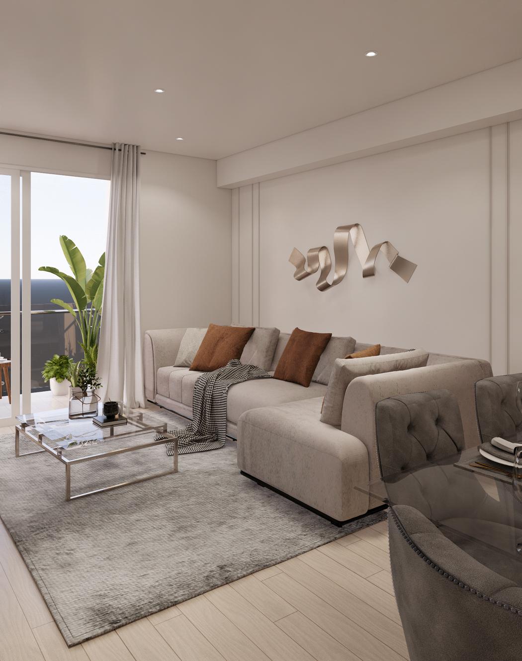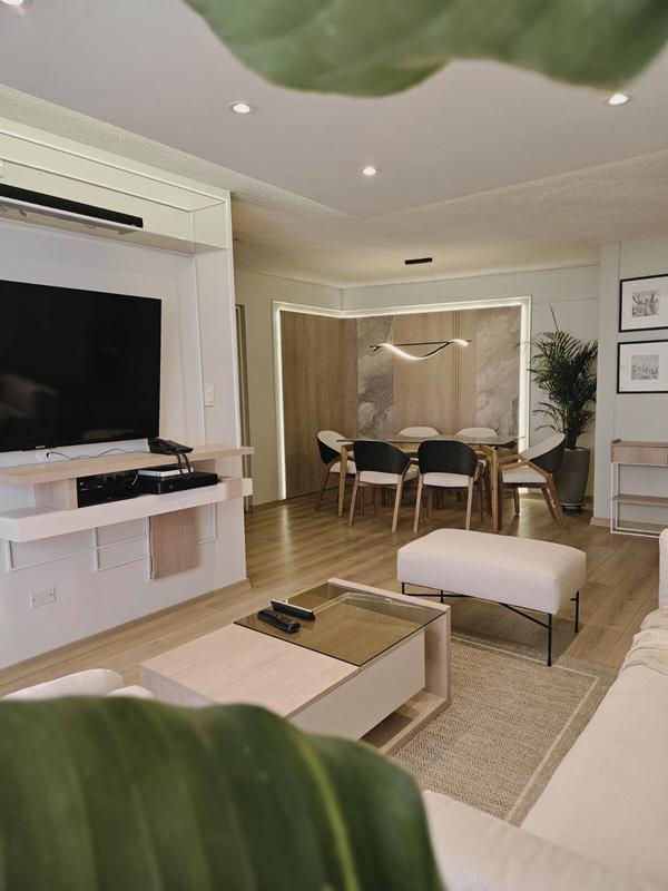También se implementó un centro de TV minimalista con texturas que destaquen y combinen con el resto de la sala.