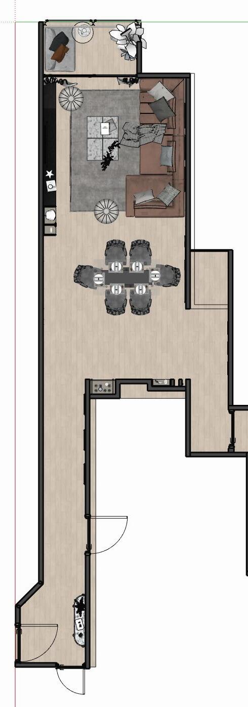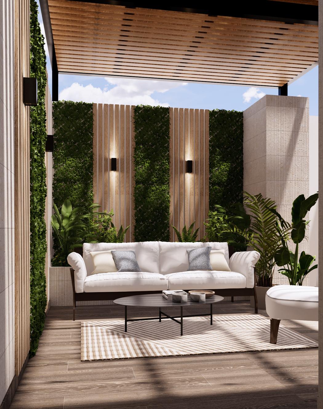 La terraza está ubicada en el primer piso de un departamento es por eso que el cliente quería darle una vista distinta a la terraza, lo cual se aplicó detalles de jardines verticales y listones, para destacar la pared, junto a diferentes plantas que brindan sensaciones frescas y tropicales