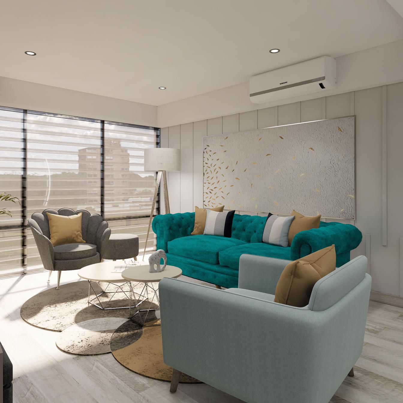 Este espacio fue diseñado utilizando mobiliario ya existente, teniendo como base el color azul, la composición del espacio se complemento con colores tierras ocres y grises en diferentes texturas.