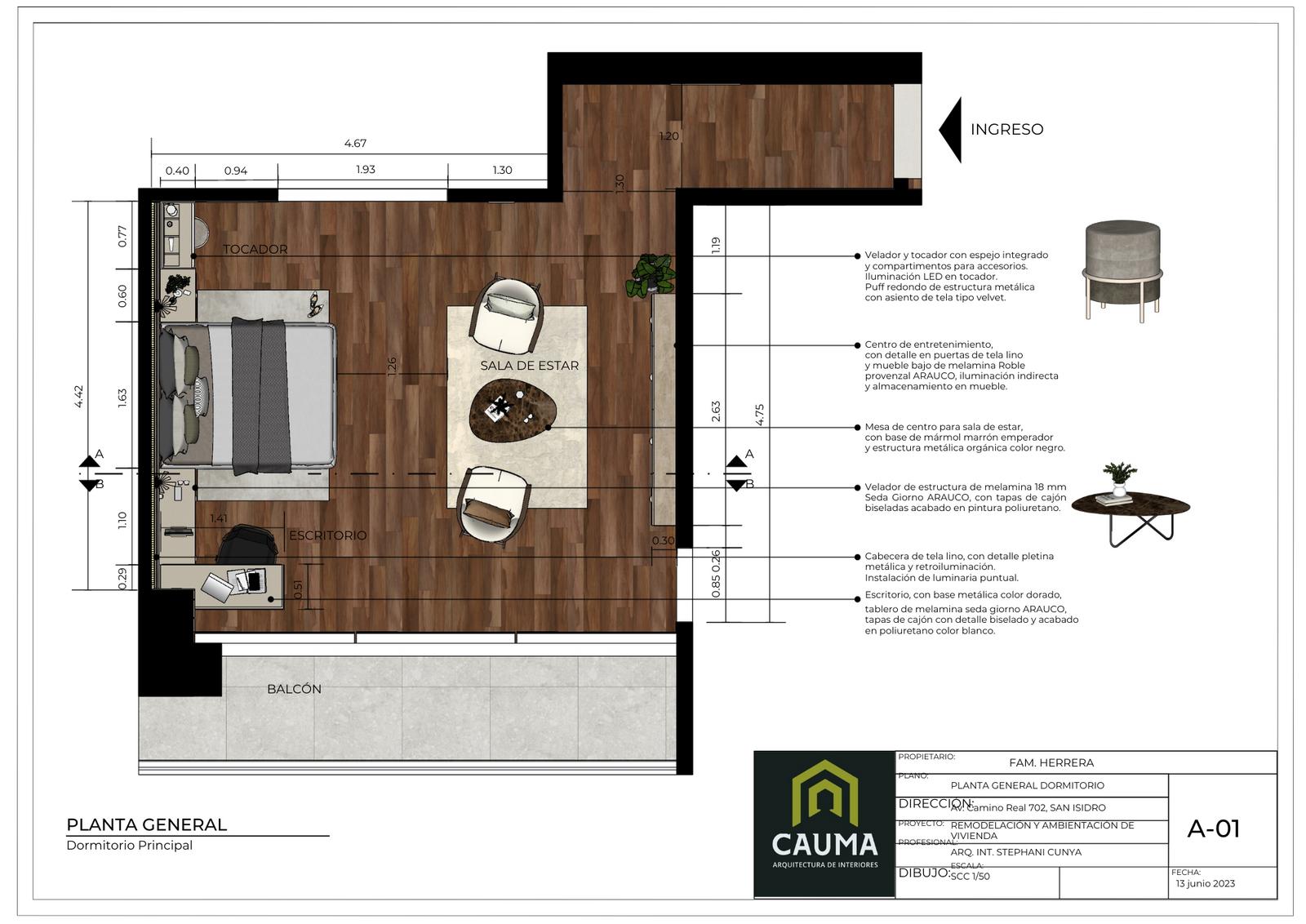 Este ambiente está pensado para una señorita de 15 años, que en su requerimiento principal detalló que el cada mueble diseñado sea móvil ya que cada cierto tiempo realizaba cambios en la habitación, es por eso que solo se trabajó en las paredes con detalles de iluminación y texturas visuales, se agregó una cabecera y se aplicó en los muebles esquinas curvas.