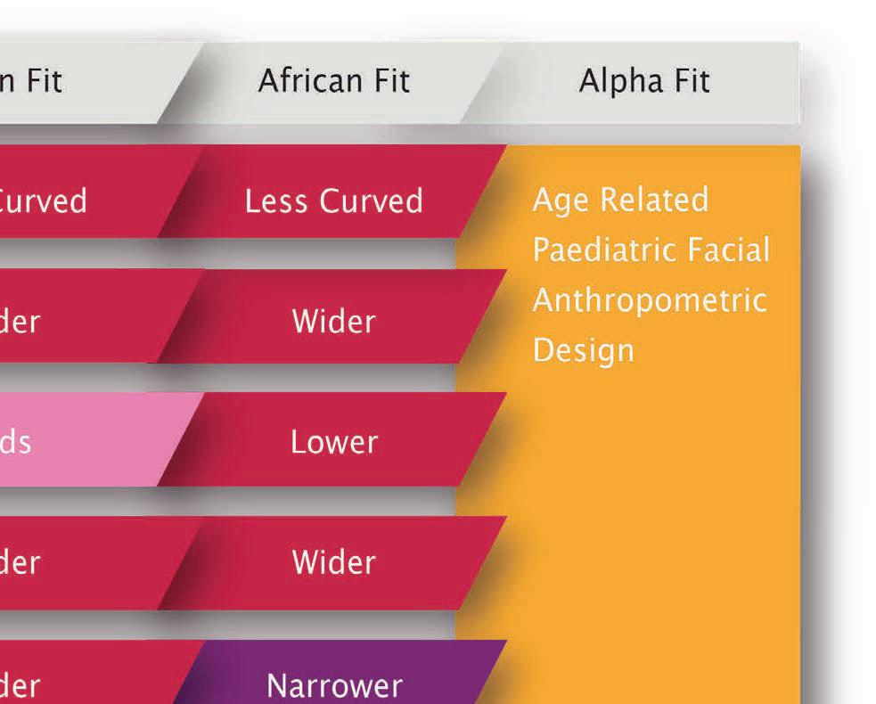 Alpha Fit hat vier Varianten. Aufgrund der Entwicklung des kindlichen Gesichts mit zunehmendem Alter erfordern kritische Veränderungen der Gesichtsform unterschiedliche Rahmenmaße. Zum Beispiel müssen Kammhöhe, Spreizung, Winkel, Kopfbreite und Pupillendistanz angepasst werden.