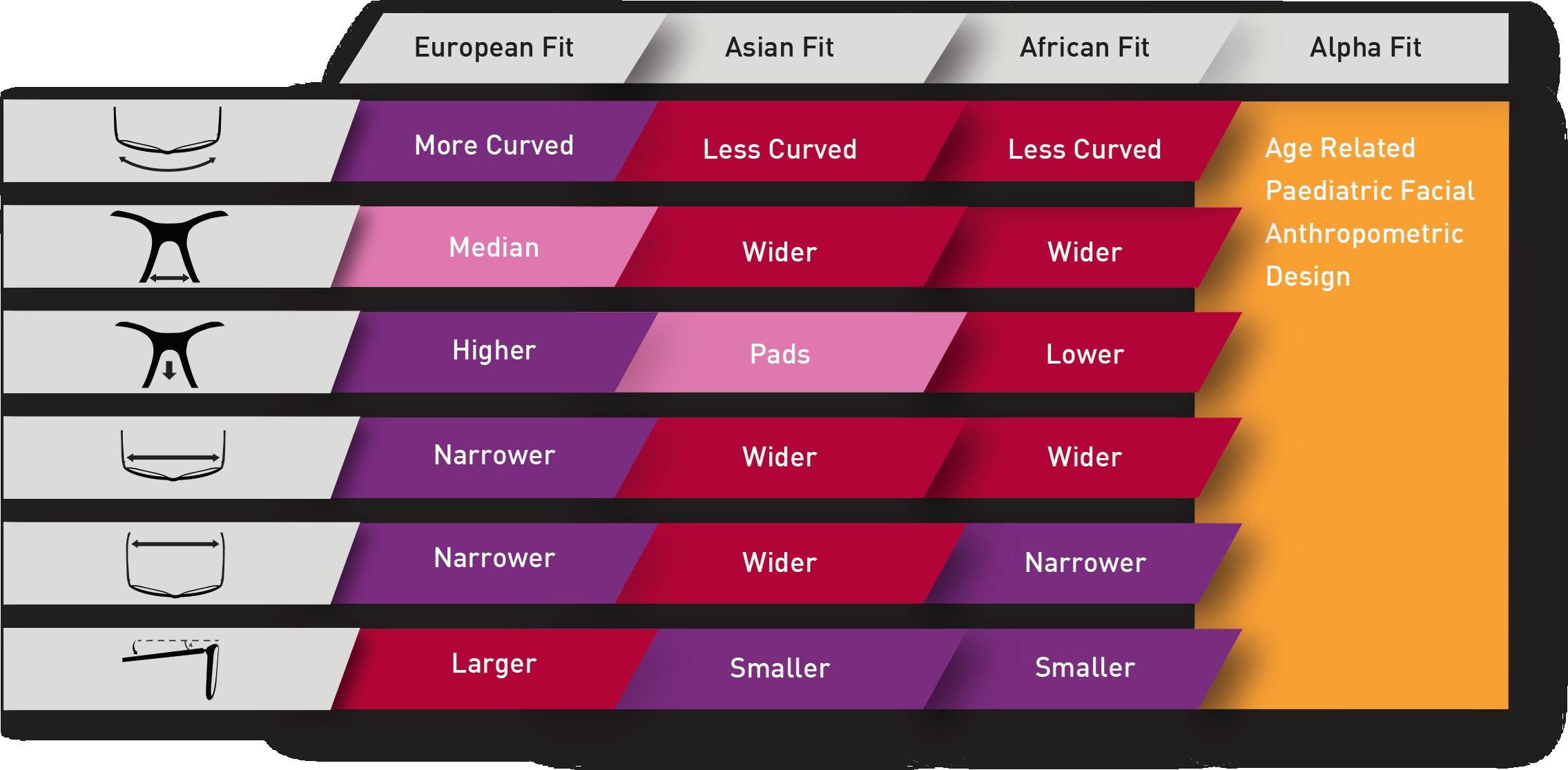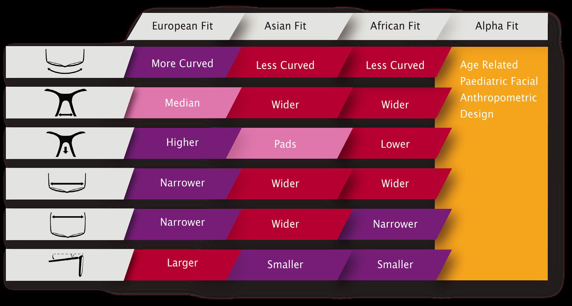 Alpha Fit has four fit variants. Due to child facial development with age, critical changes in the face shape require different frame measurements. For example, crest height, splay, angle, head width and pupillary distance requires accommodating.
