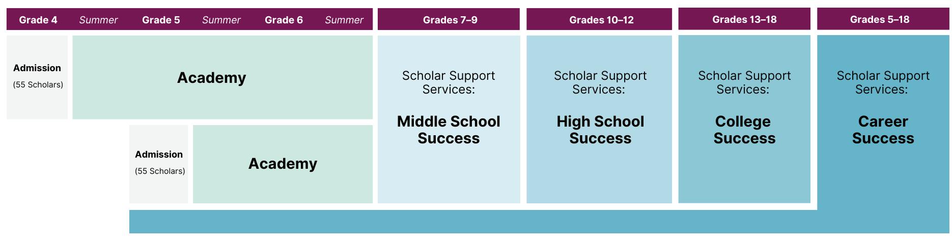 Scholars have access to Steppingstone programming and resources for more than 12 years, from elementary school through college graduation.