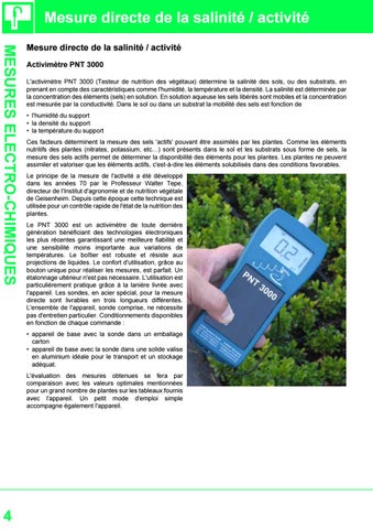 Mesure directe de la salinité / activité Activimètre PNT 3000 L'activimètre PNT 3000 (Testeur de nutrition des végétaux) détermine la salinité des sols, ou des substrats, en prenant en compte des caractéristiques comme l'humidité, la température et la densité. La salinité est déterminée par la concentration des éléments (sels) en solution. En solution aqueuse les sels libérés sont mobiles et la concentration est mesurée par la conductivité. Dans le sol ou dans un substrat la mobilité des sels est fonction de • l'humidité du support • la densité du support • la température du support Ces facteurs déterminent la mesure des sels 'actifs' pouvant être assimilés par les plantes. Comme les éléments nutritifs des plantes (nitrates, potassium, etc…) sont présents dans le sol et les substrats sous forme de sels, la mesure des sels actifs permet de déterminer la disponibilité des éléments pour les plantes. Les plantes ne peuvent assimiler et valoriser que les éléments actifs, c'est-à-dire les éléments solubilisés dans des conditions favorables. Le principe de la mesure de l'activité a été développé dans les années 70 par le Professeur Walter Tepe, directeur de l'Institut d'agronomie et de nutrition végétale de Geisenheim. Depuis cette époque cette technique est utilisée pour un contrôle rapide de l'état de la nutrition des plantes. Le PNT 3000 est un activimètre de toute dernière génération bénéficiant des technologies électroniques les plus récentes garantissant une meilleure fiabilité et une sensibilité moins importante aux variations de températures. Le boîtier est robuste et résiste aux projections de liquides. Le confort d'utilisation, grâce au bouton unique pour réaliser les mesures, est parfait. Un étalonnage ultérieur n'est pas nécessaire. L'utilisation est particulièrement pratique grâce à la lanière livrée avec l'appareil. Les sondes, en acier spécial, pour la mesure directe sont livrables en trois longueurs différentes. L'ensemble de l'appareil, sonde comprise, ne nécessite pas d'entretien particulier. Conditionnements disponibles en fonction de chaque commande : • appareil de base avec la sonde dans un emballage carton • appareil de base avec la sonde dans une solide valise en aluminium idéale pour le transport et un stockage adéquat. L'évaluation des mesures obtenues se fera par comparaison avec les valeurs optimales mentionnées pour un grand nombre de plantes sur les tableaux fournis avec l'appareil. Un petit mode d'emploi simple accompagne également l'appareil.