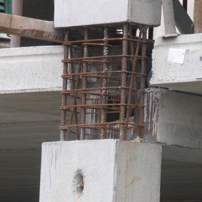 Alla sommità del primo concio bipiano dei pilastri si notano i tirafondi di sommità per la connessione con il secondo concio. Nel particolare si notano gli stessi tirafondi sporgenti all’estradosso del getto del secondo solaio.