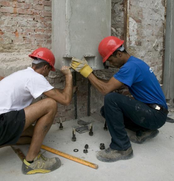 Gli elementi verticali delle scarpe dopo il serraggio dei bulloni, vengono inghisati con malta espansiva, attraverso le guaine fuoriuscenti da una faccia laterale, pronti per la posa in autoportanza di travi, solai e scale.