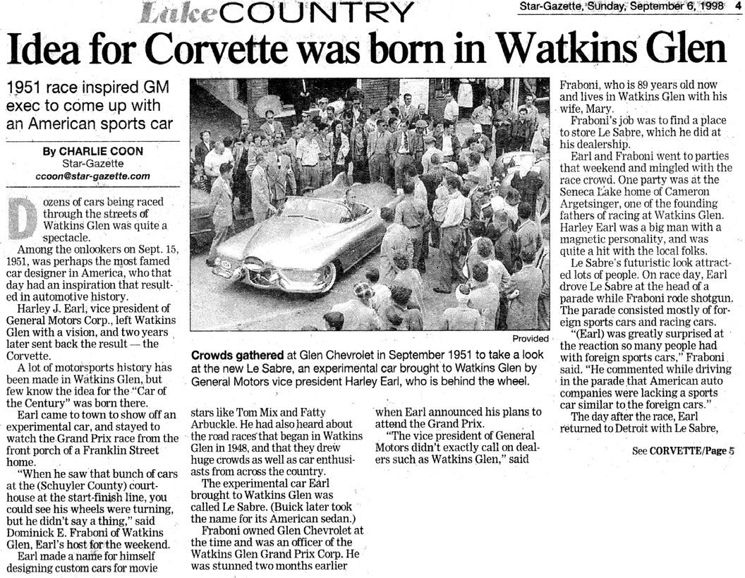 The inspiration for the Corvette came from Harley Earl's visit to Watkins Glen during the 1951 Grand Prix.