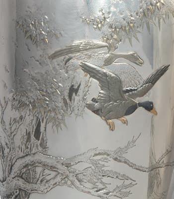 A most appealing pair of Meiji period (1868-1912) pure silver mixed metal vases, each fully artist signed and bearing the Shobido Company seal. The finely worked vases decorated with highly sought after winter scenes of birds in snowy landscapes and waterside settings. The left-hand vase depicts ducks in flight within a backdrop of snow covered foliage, the opposing vase depicts a group of ducks upon a snow covered lakeside bank, each vase finely chiselled by the recorded Meiji period artist, Kobayashi Shoun. The engraved signature on the vases reads “Shoun koku” (engraved by Shoun), whilst the underside of each vase is sealed by the Shobido Company.
