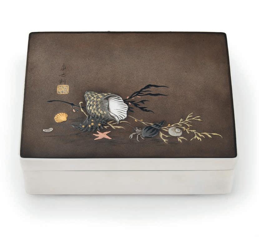 A most unusual late Meiji period (1868-1912), early Taisho period (1912-1926) pure silver and mixed metal lidded box by the highly regarded artist Sekiguchi Shinya, his art name Chitokusai. This delightful box is manufactured from pure silver and stands upon bracket feet, the shibuichi and mixed metal lid is most unusually decorated with Japanese marine life including seaweed, shells, molluscs, starfish and a hermit crab. A simple yet poignant snapshot of everyday staple foods that surrounded these shores, now brilliantly portrayed by an artist that would have likely enjoyed some of these seafoods as part of his diet. The lid bears an inscription that reads Shinya Koku (carved by Shinya) aside a Shinya seal. A most charming box manufactured by a highly regarded and well recorded artist of the Meiji/ Taisho period.