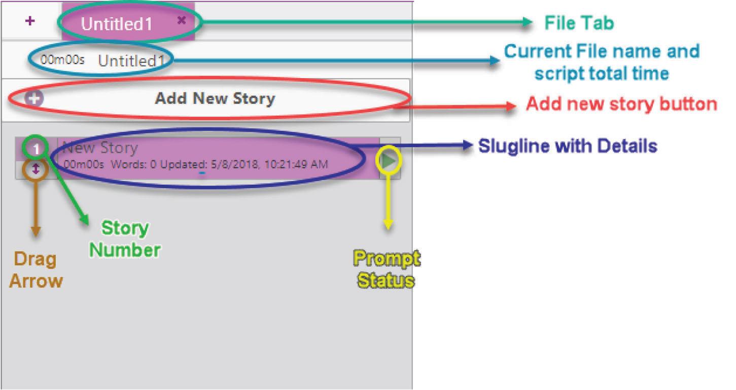 For each script a “Story” tab will be added in the Runorder Panel (left side of the screen). Your script will be displayed in the edit area, (body center) of the program.