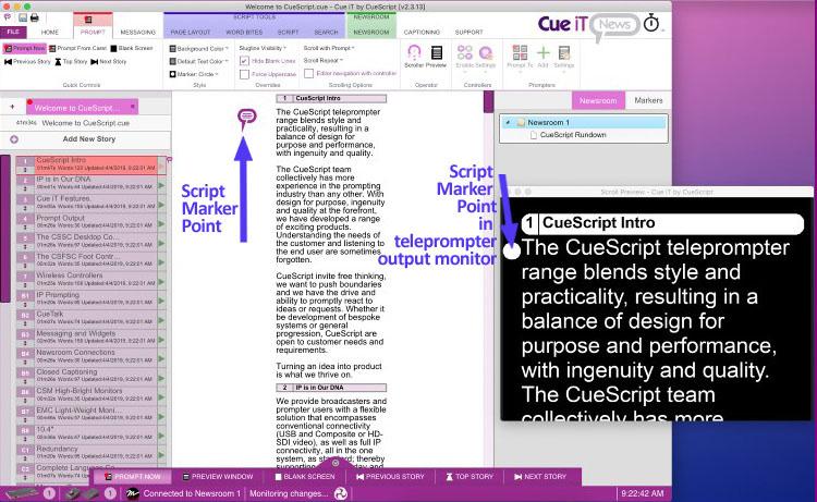 ● Before selecting “Prompter Now” note that the location of your cursor indicates where the script will open in romper mode. In the output teleprompter monitor, the talent will see the marker as a white dot, while you will see the marker as a Cue iT text bubble ico