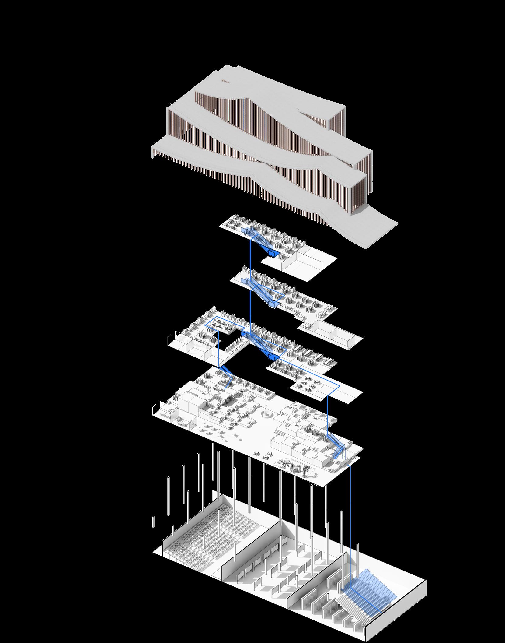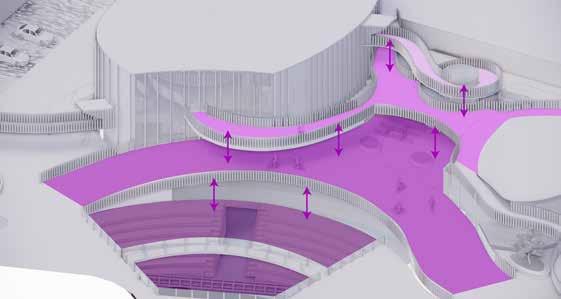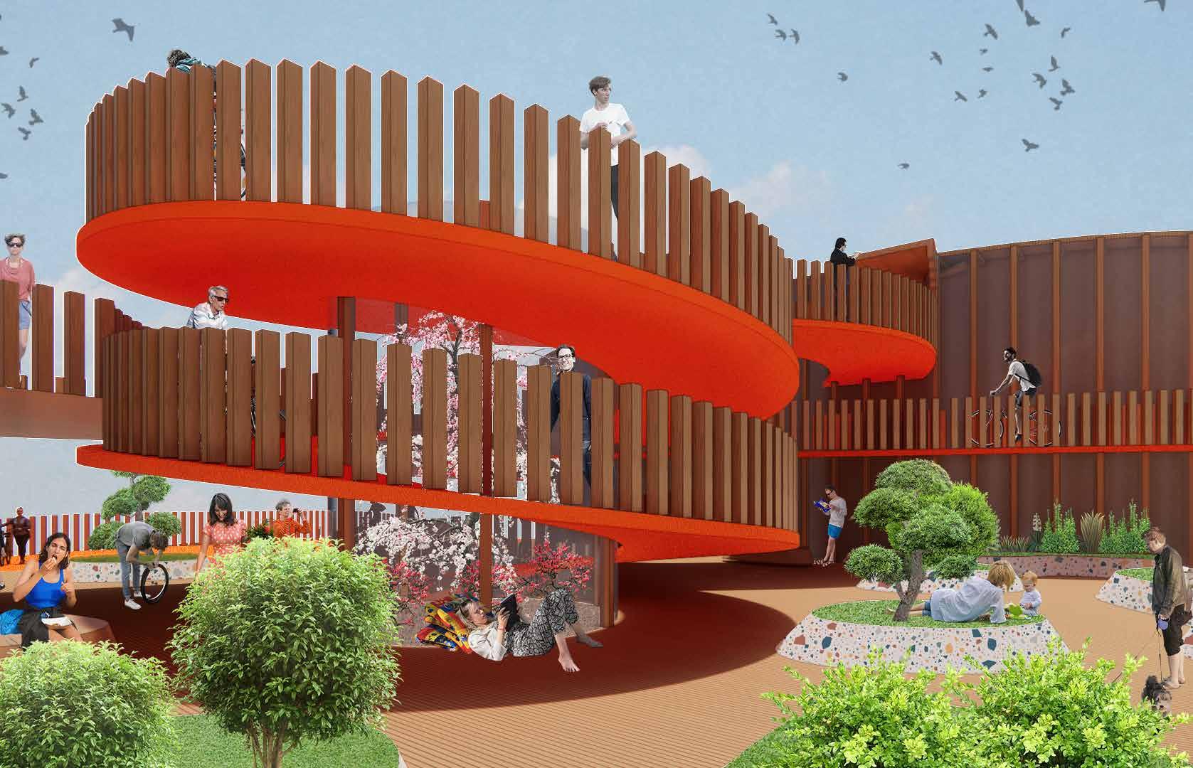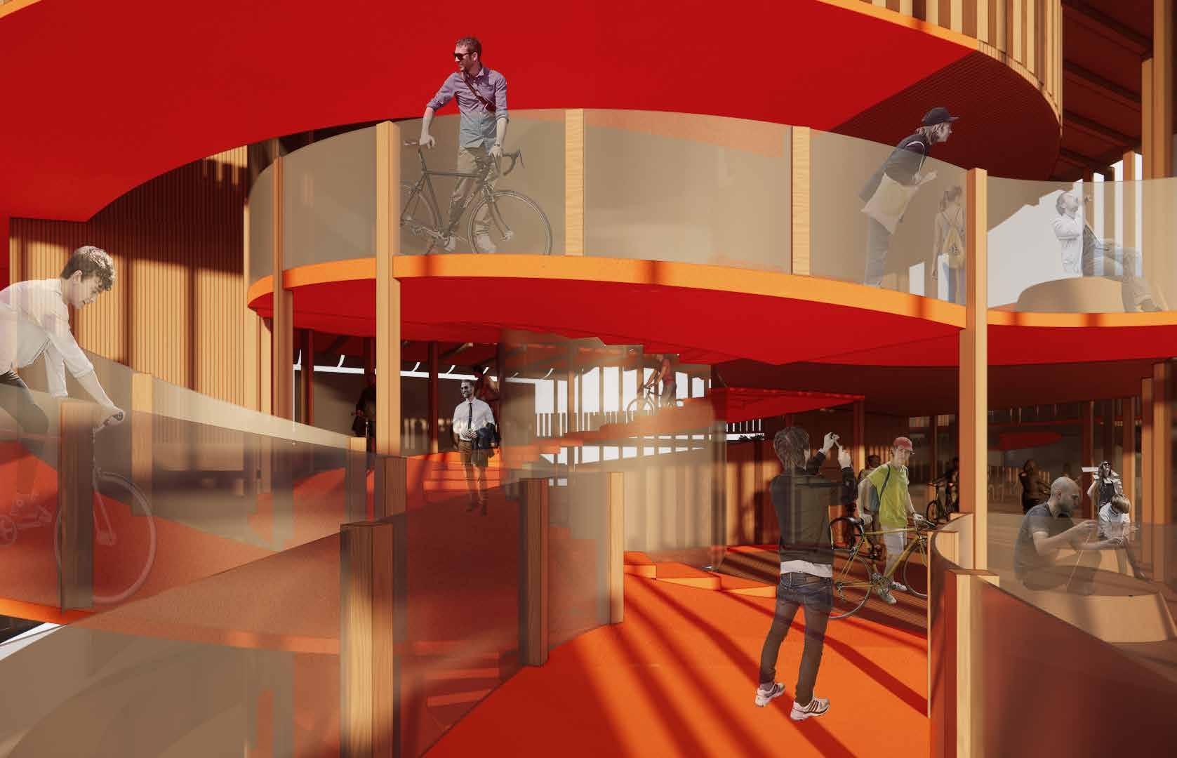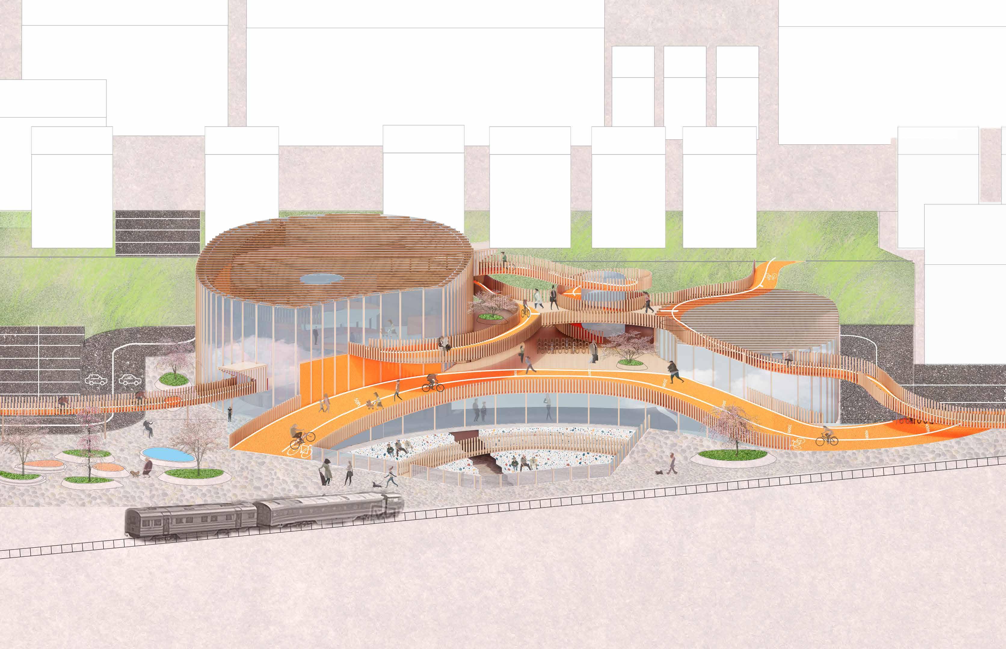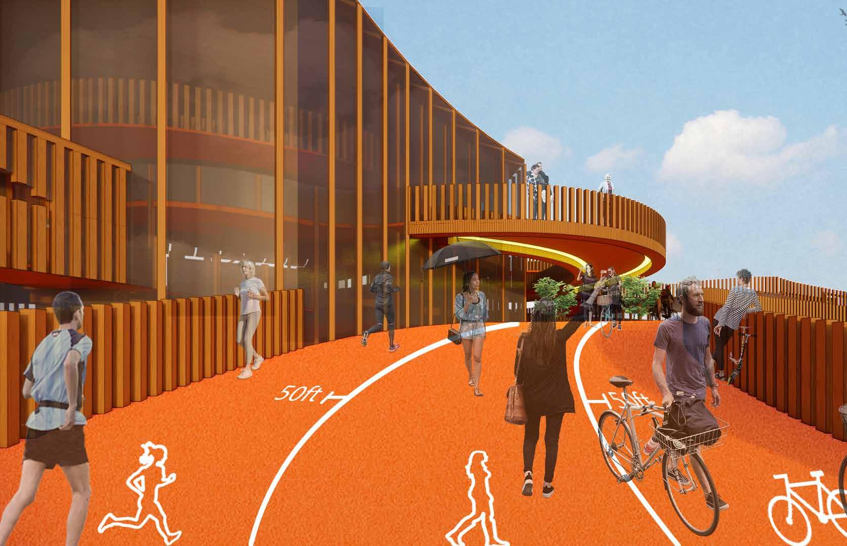Various building components are seamlessly connected via ramps, catering to cyclists, runners, pedestrians, and wheelchair users alike.