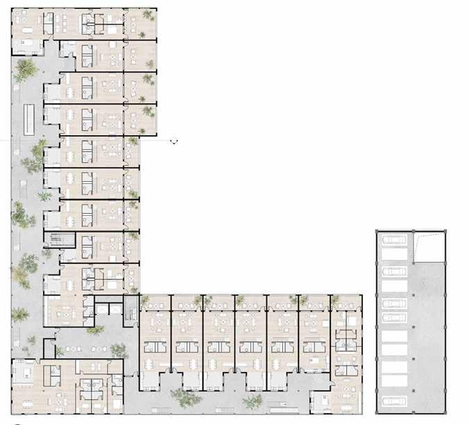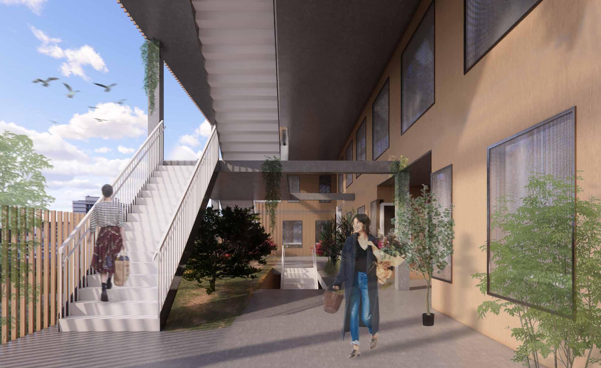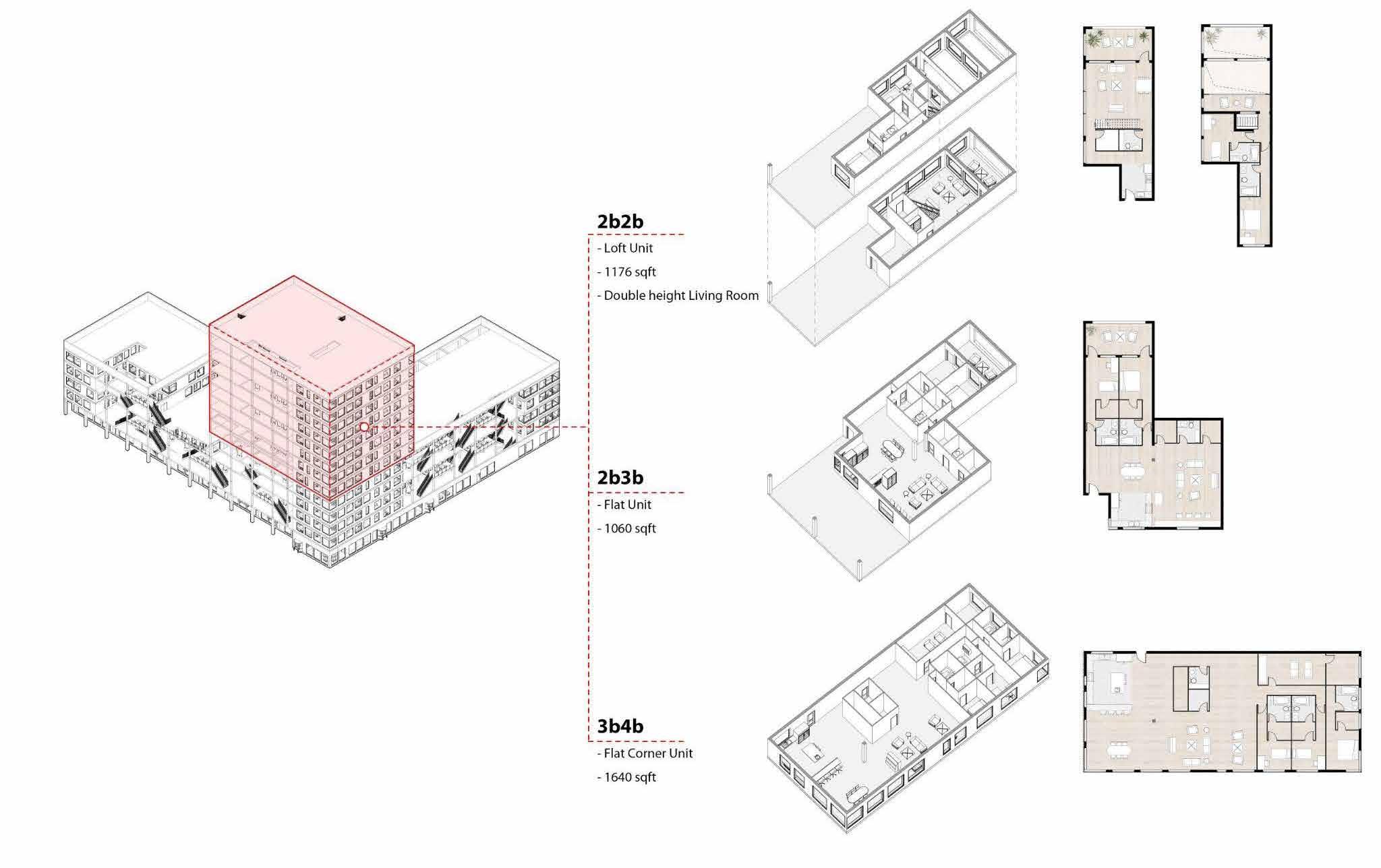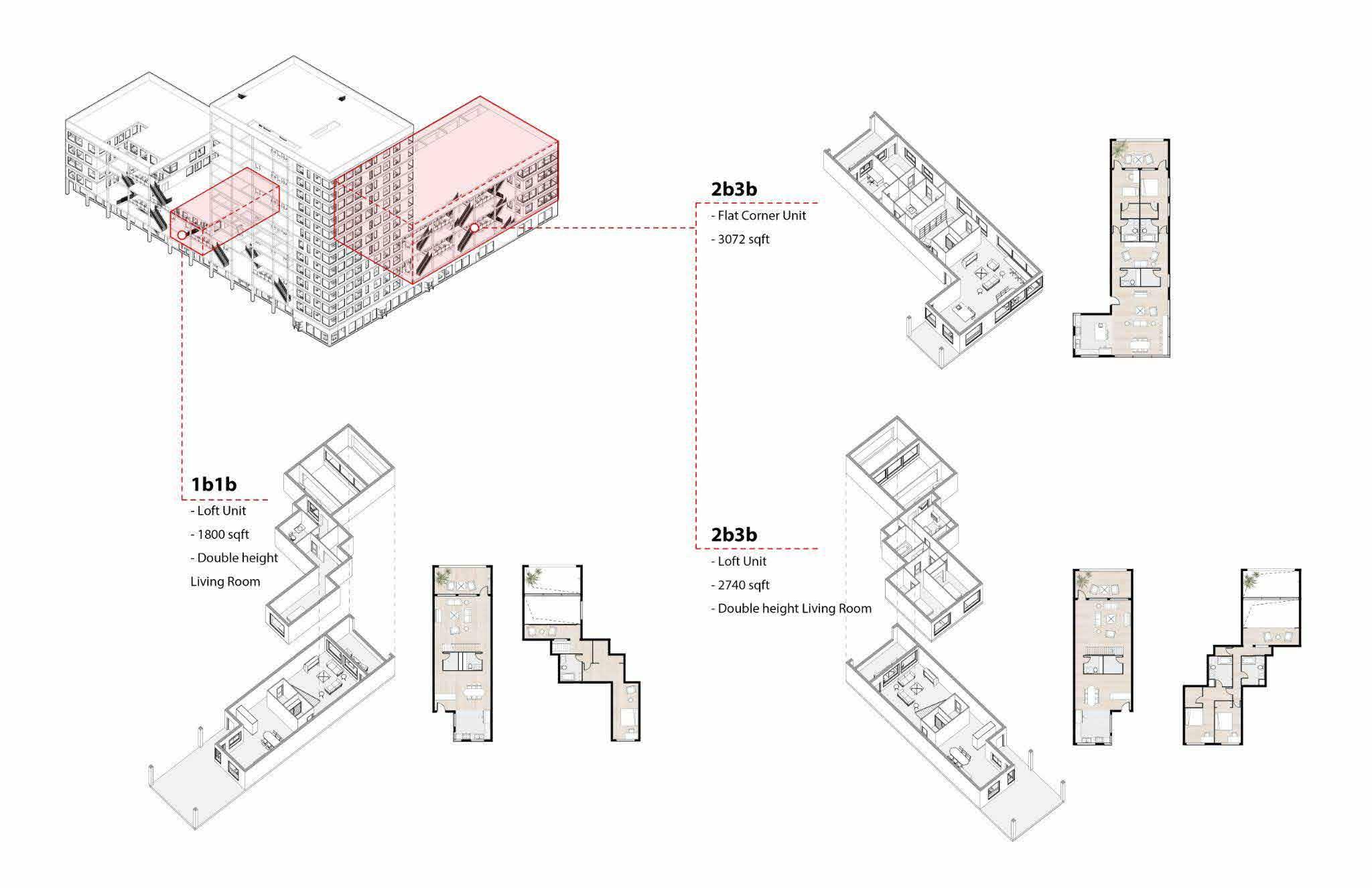 The project redefines urban living by integrating suburban charm— porches and gardens into the city. By translating these features into vertical semi-private porches and semipublic courtyards, the design merges suburban tranquility with urban convenience. This approach fosters community, enhances access to amenities, and promotes a balanced urban lifestyle that encourages residents to stay in the city.