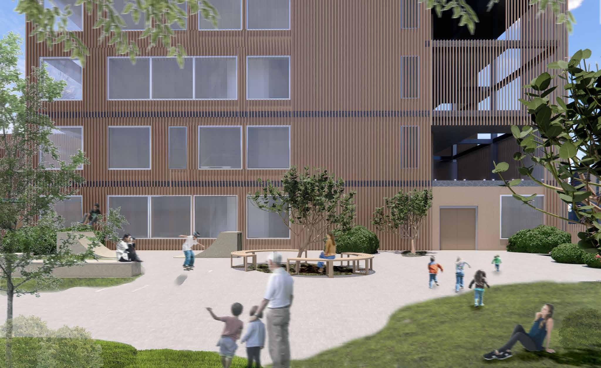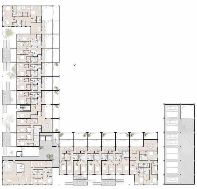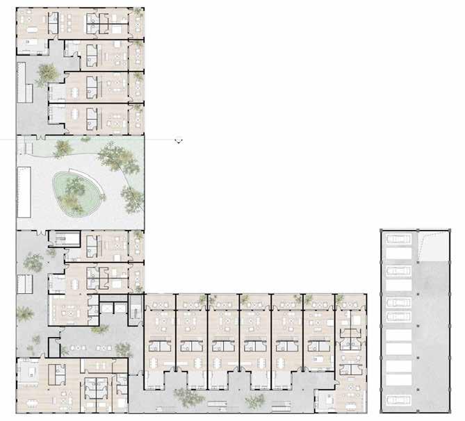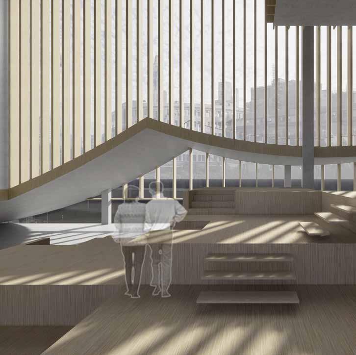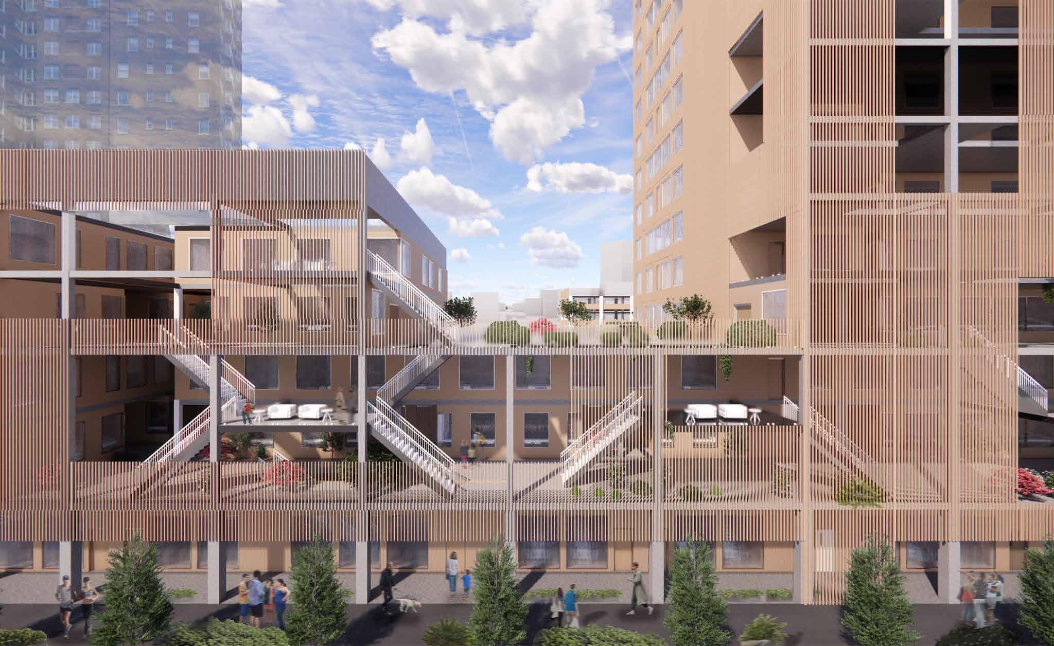 The project redefines urban living by integrating suburban charm— porches and gardens into the city. By translating these features into vertical semi-private porches and semipublic courtyards, the design merges suburban tranquility with urban convenience. This approach fosters community, enhances access to amenities, and promotes a balanced urban lifestyle that encourages residents to stay in the city.